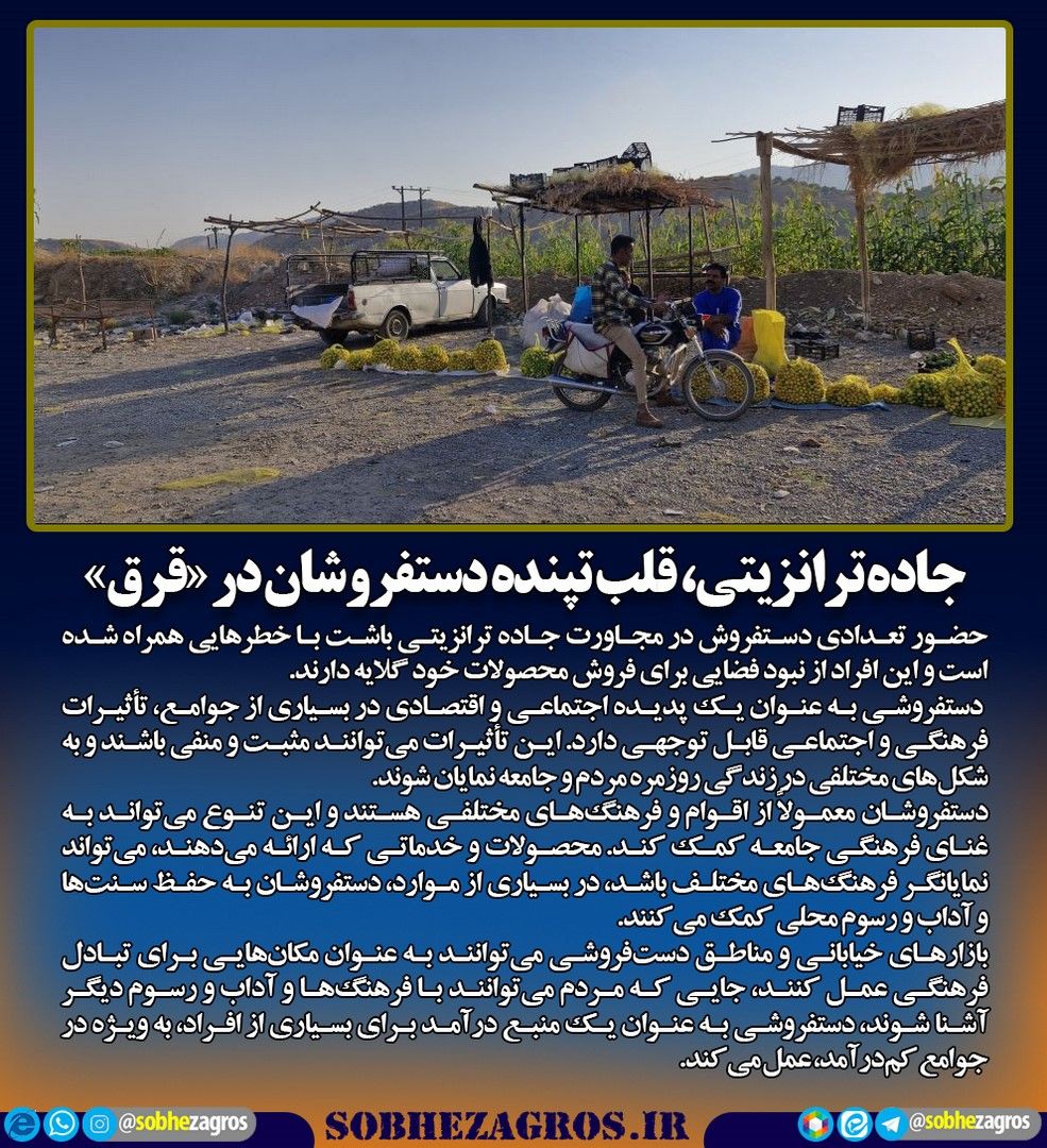 حضور تعدادی دستفروش در مجاورت جاده ترانزیتی باشت با خطرهایی همراه شده است و این افراد از نبود فضایی برای فروش محصولات خود گلایه دارند.(اینجا)