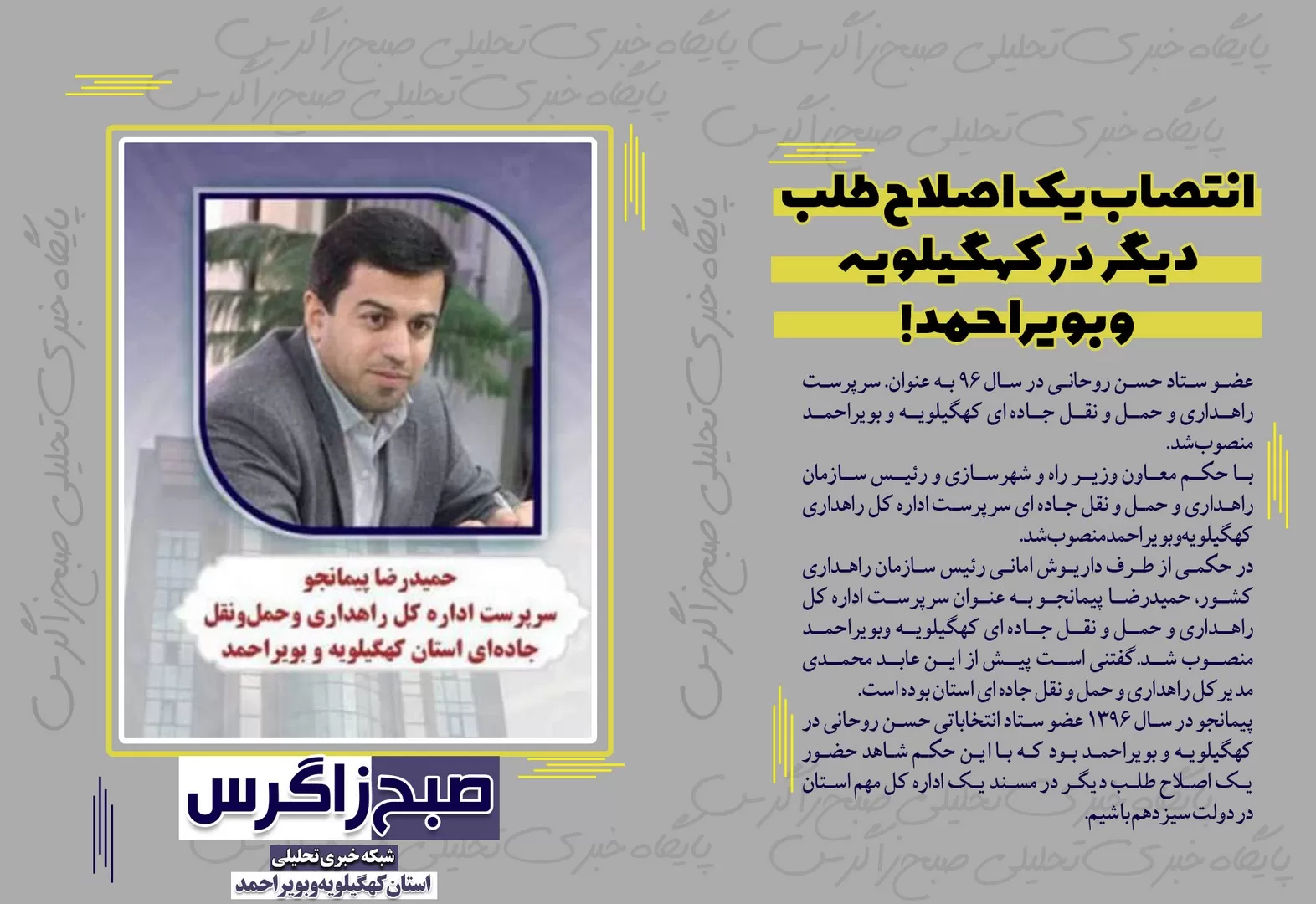 صبح زاگرس در این قسمت از عکس نوشته های خود به انتصاب یک اصلاح طلب از هم قطاران دولت روحانی بر مسند یکی از مهمترین ادارات خدمات رسان استان اختصاص داده شده است.