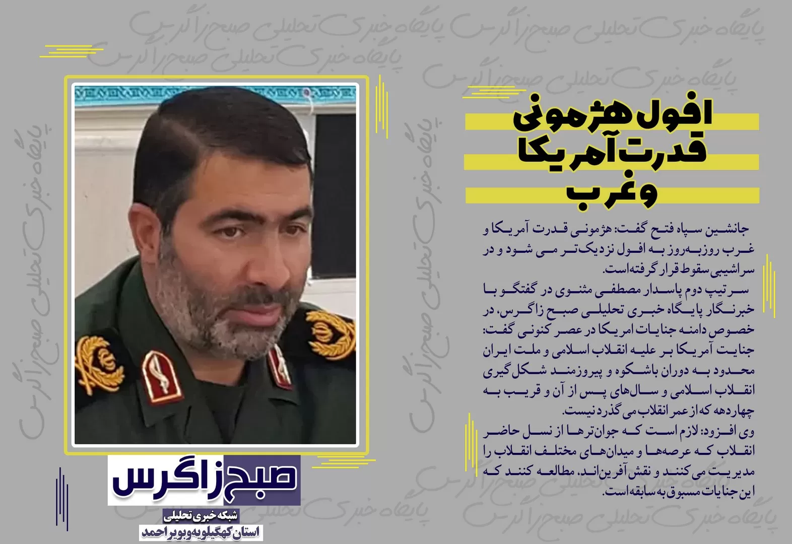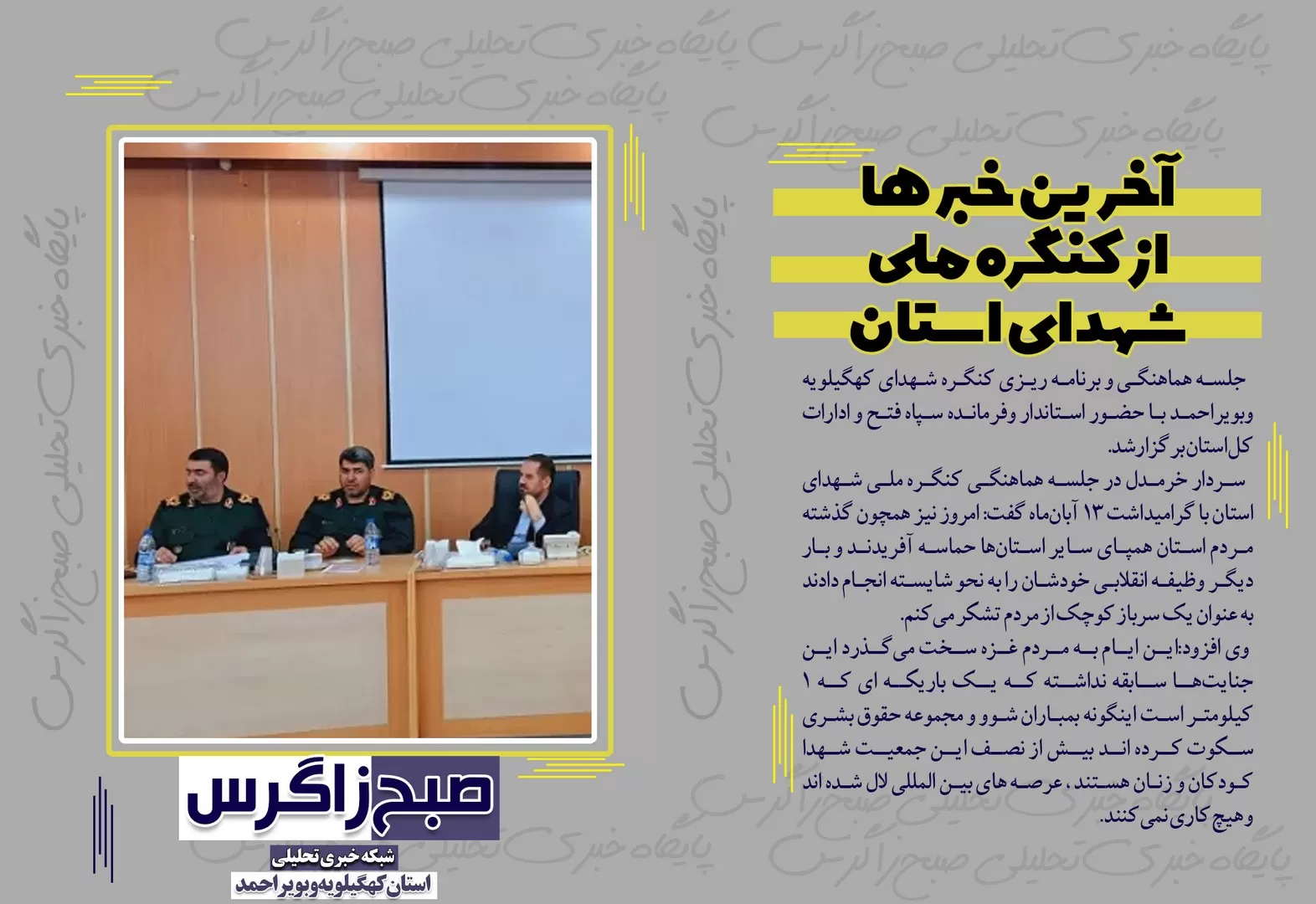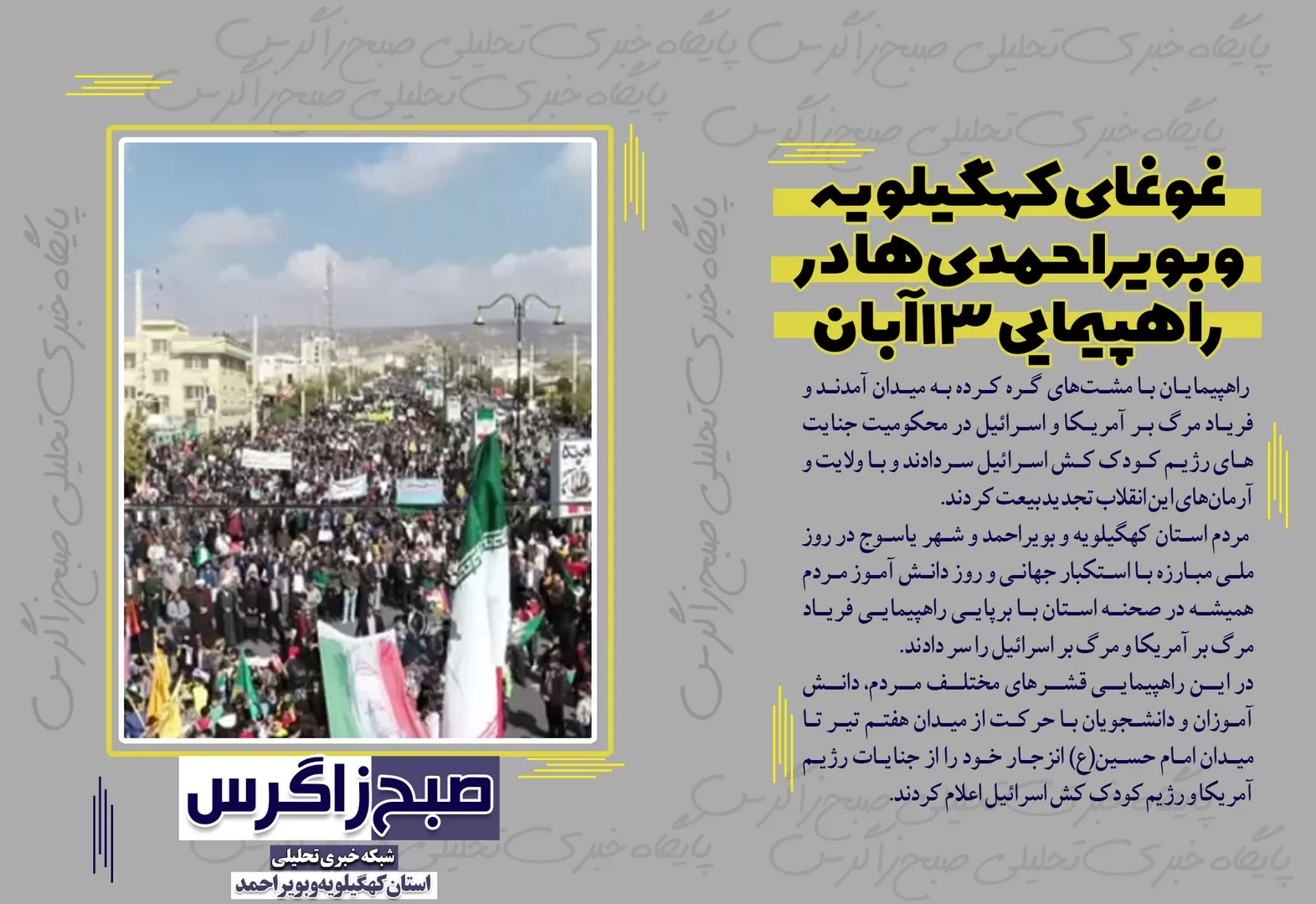 به گزارش پایگاه خبری تحلیلی صبح زاگرس؛افول هژمونی قدرت آمریکا و غرب،آخرین خبر ها از کنگره ملی شهدای استان،غوغای کهگیلویهوبویراحمدیها در راهپیمایی 13آبان،انتصاب یک اصلاح طلب دیگر در کهگیلویهوبویراحمد! واینجا گَرگَر همچنان قربانی می گیرد از جمله فتونیوز های صبح زاگرس است.
