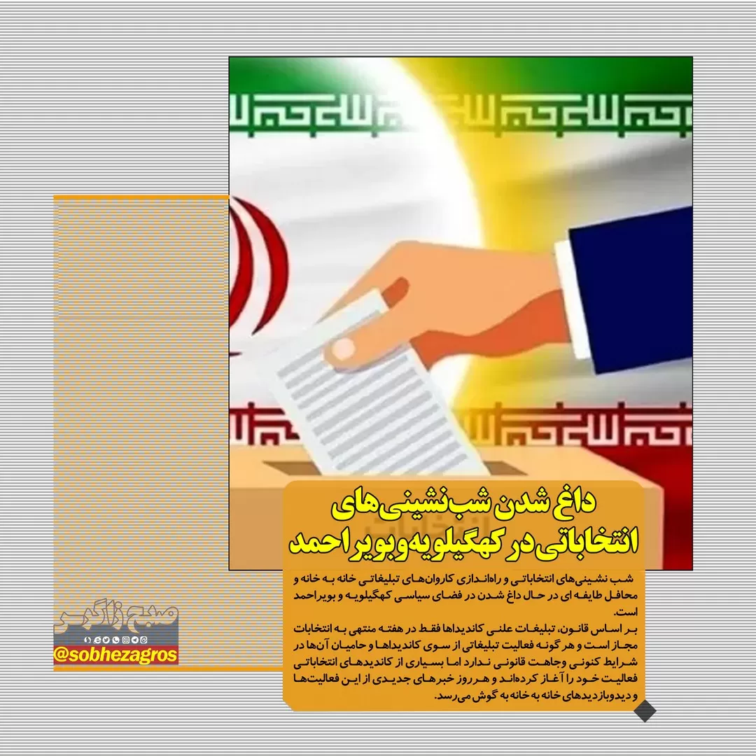 صبح زاگرس در این قسمت از عکس نوشته های خود به داغ شدن شب نشینی های انتخاباتی در مناطق مختلف کهگیلویه وبویراحمد اختصاص داده شده که بر اساس قانون تخلف محسوب میشود.