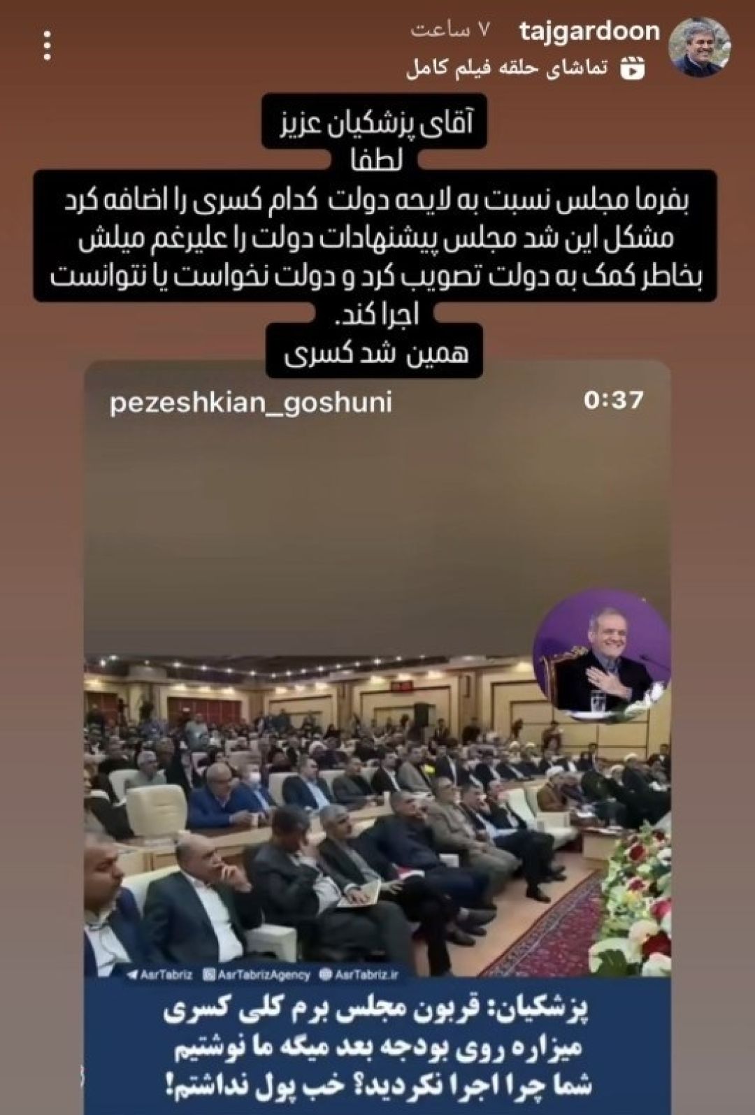 تاجگردون در یادداشت خود خطاب به رئیسجمهور نوشت: «آقای پزشکیان عزیز، لطفاً توضیح بفرمایید مجلس نسبت به لایحه دولت کدام کسری را اضافه کرد؟ مشکل از آنجا آغاز شد که مجلس، علیرغم میل و دیدگاه کارشناسی خود، برای همراهی و حمایت از دولت، پیشنهادات شما را تصویب کرد؛ اما دولت نخواست یا نتوانست آنها را اجرا کند. همین شد کسری.»