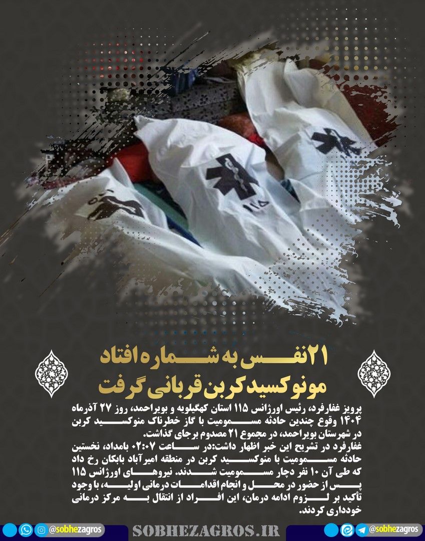 رئیس اورژانس ۱۱۵ استان کهگیلویه و بویراحمد گفت: در روز ۲۷ آذرماه ۱۴۰۴ وقوع چندین حادثه مسمومیت با گاز خطرناک منوکسید کربن در شهرستان بویراحمد، در مجموع ۲۱ مصدوم برجای گذاشت.(اینجا)