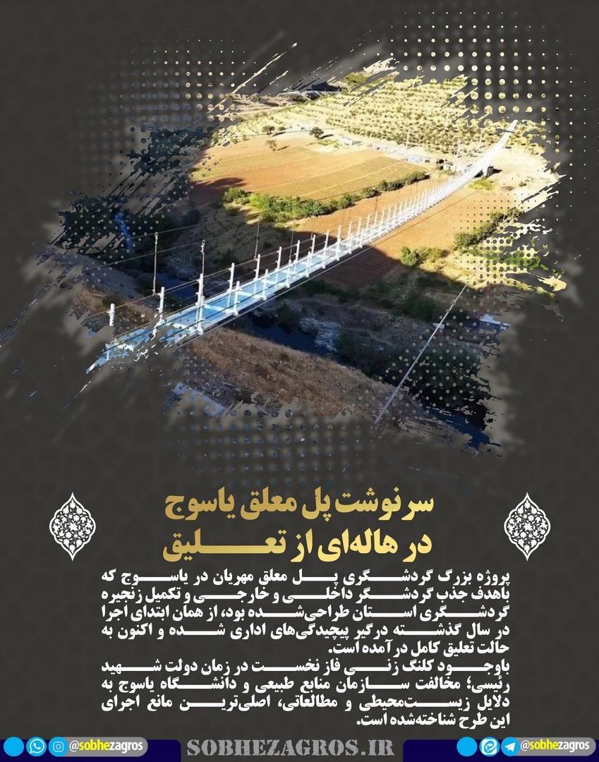 پروژه بزرگ گردشگری پل معلق مهریان در یاسوج که باهدف جذب گردشگر داخلی و خارجی و تکمیل زنجیره گردشگری استان طراحیشده بود، از همان ابتدای اجرا در سال گذشته درگیر پیچیدگیهای اداری شده و اکنون به حالت تعلیق کامل درآمده است.(اینجا)