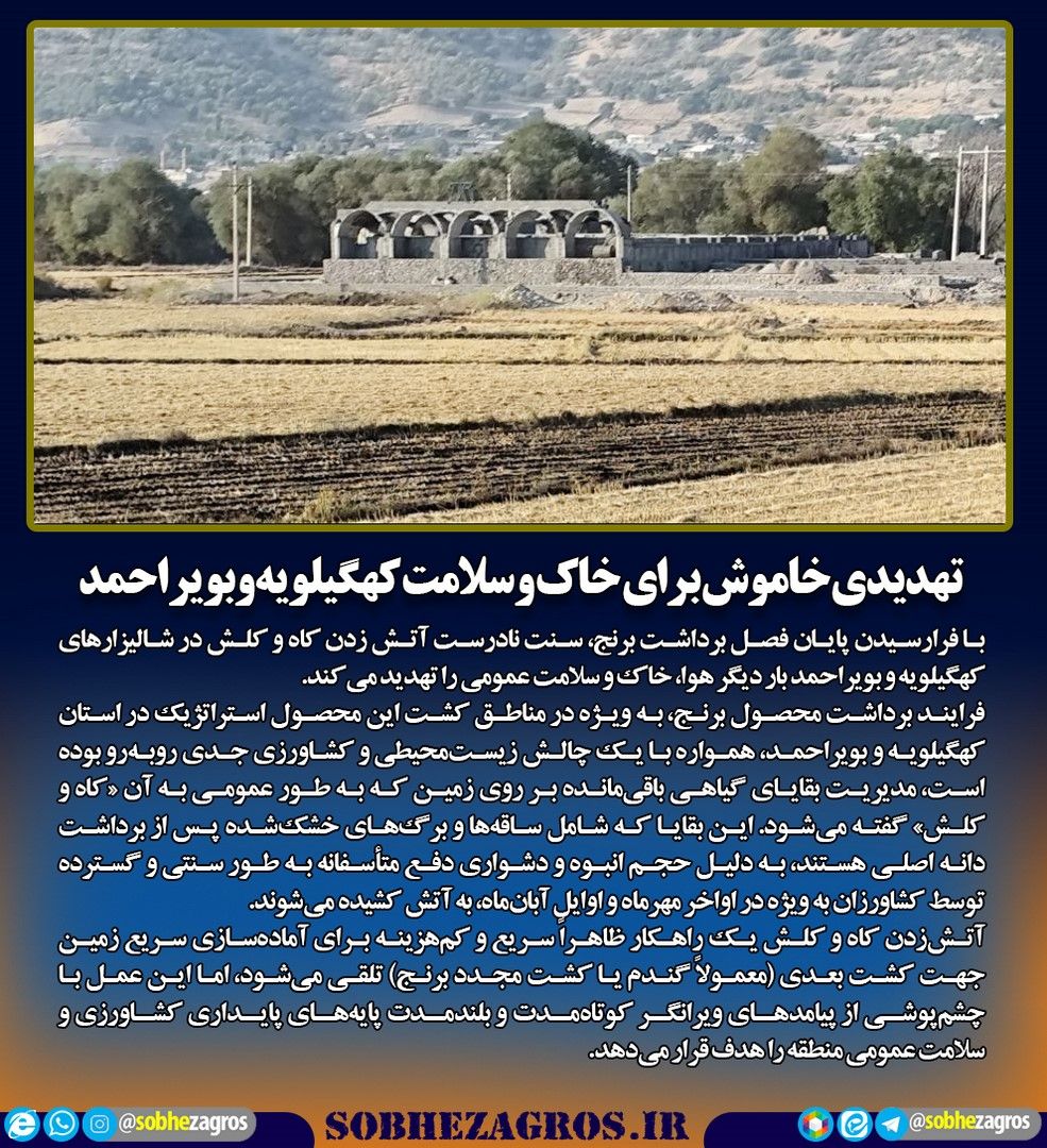 با فرارسیدن پایان فصل برداشت برنج، سنت نادرست آتش زدن کاه و کلش در شالیزارهای کهگیلویه و بویراحمد بار دیگر هوا، خاک و سلامت عمومی را تهدید میکند.(اینجا)