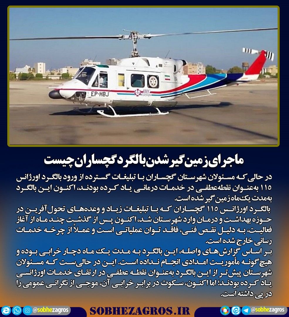 در حالیکه مسئولان شهرستان گچساران با تبلیغات گسترده از ورود بالگرد اورژانس ۱۱۵ بهعنوان نقطهعطفی در خدمات درمانی یاد کرده بودند، اکنون این بالگرد بهمدت یکماه زمینگیر شده است.(اینجا)
