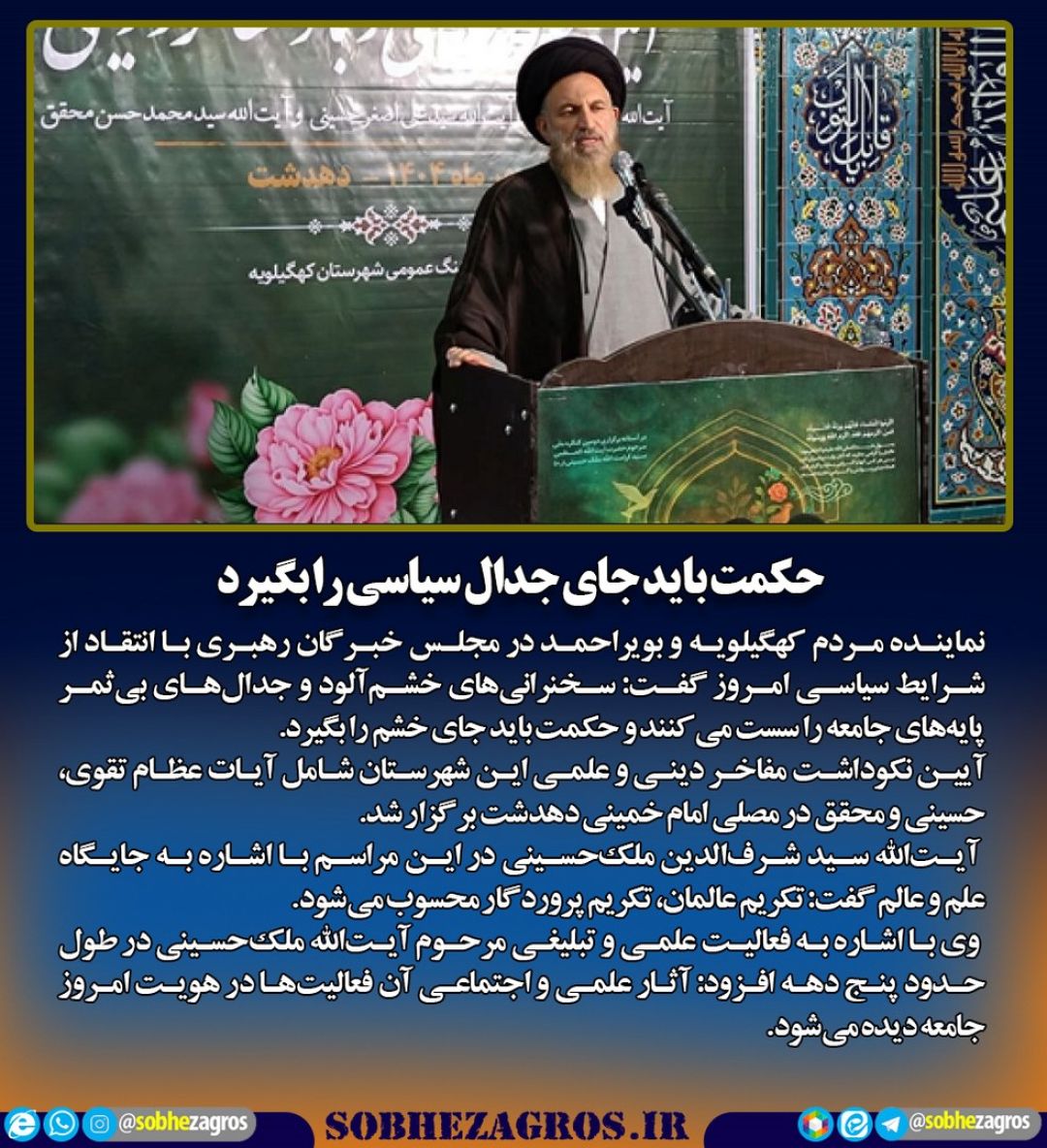 نماینده مردم کهگیلویه و بویراحمد در مجلس خبرگان رهبری با انتقاد از شرایط سیاسی امروز گفت: سخنرانیهای خشمآلود و جدالهای بیثمر پایههای جامعه را سست میکنند و حکمت باید جای خشم را بگیرد.(اینجا)