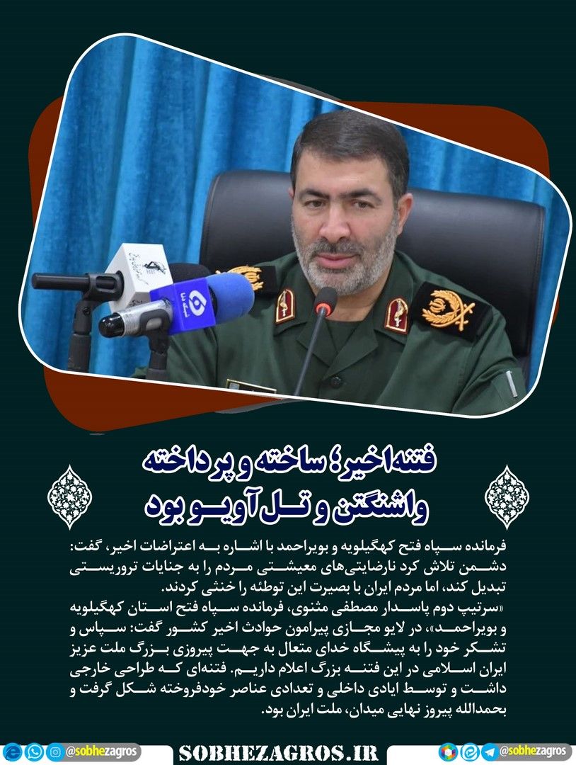فرمانده سپاه فتح کهگیلویه و بویراحمد با اشاره به اعتراضات اخیر، گفت: دشمن تلاش کرد نارضایتیهای معیشتی مردم را به جنایات تروریستی تبدیل کند، اما مردم ایران با بصیرت این توطئه را خنثی کردند.(اینجا)