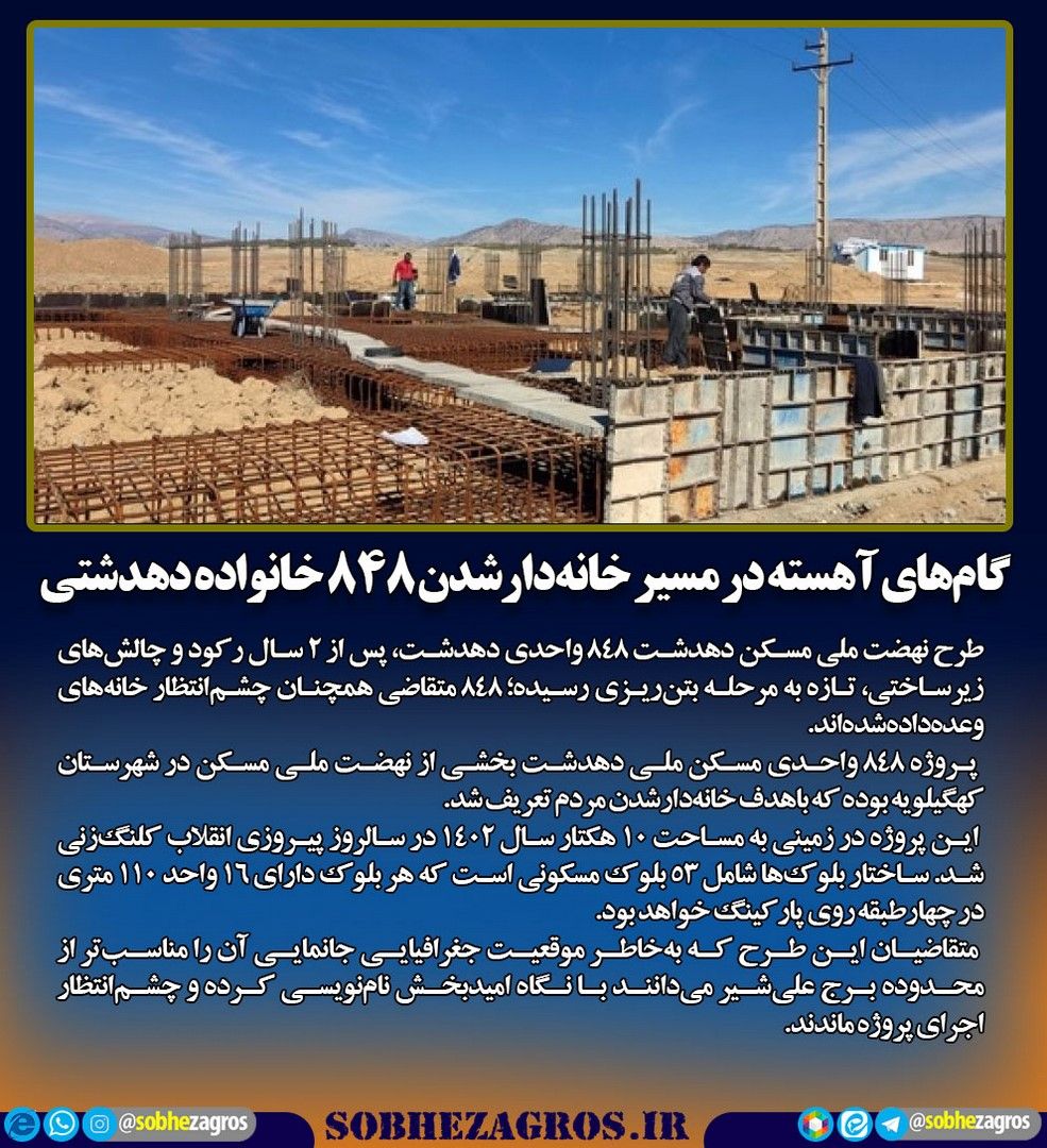 طرح نهضت ملی مسکن دهدشت 848 واحدی دهدشت، پس از 2 سال رکود و چالشهای زیرساختی، تازه به مرحله بتنریزی رسیده؛ 848 متقاضی همچنان چشمانتظار خانههای وعدهدادهشدهاند.(اینجا)