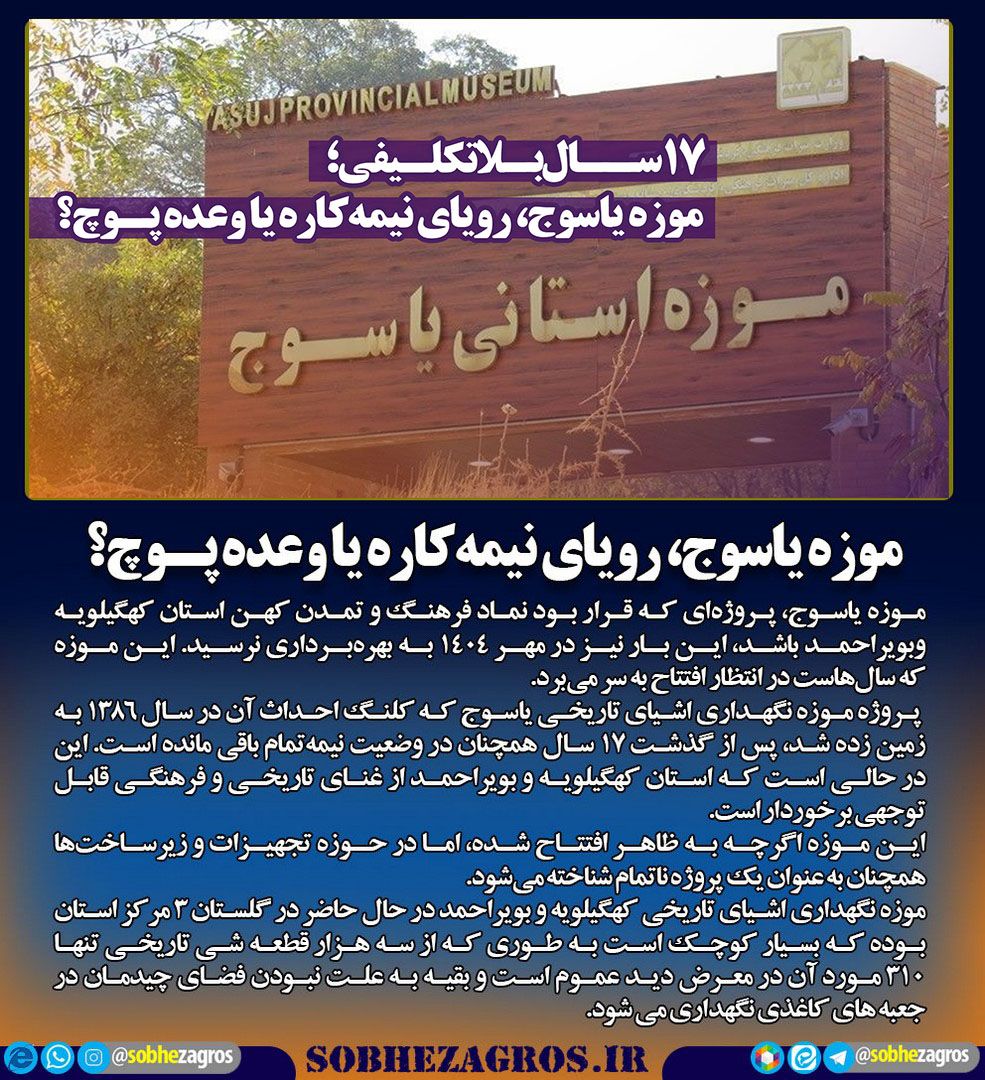 صبح زاگرس در الین قسمت از عکس نوشتههای خود به رویای نیمه کاره موزه یاسوج اختصاص داده شده است.