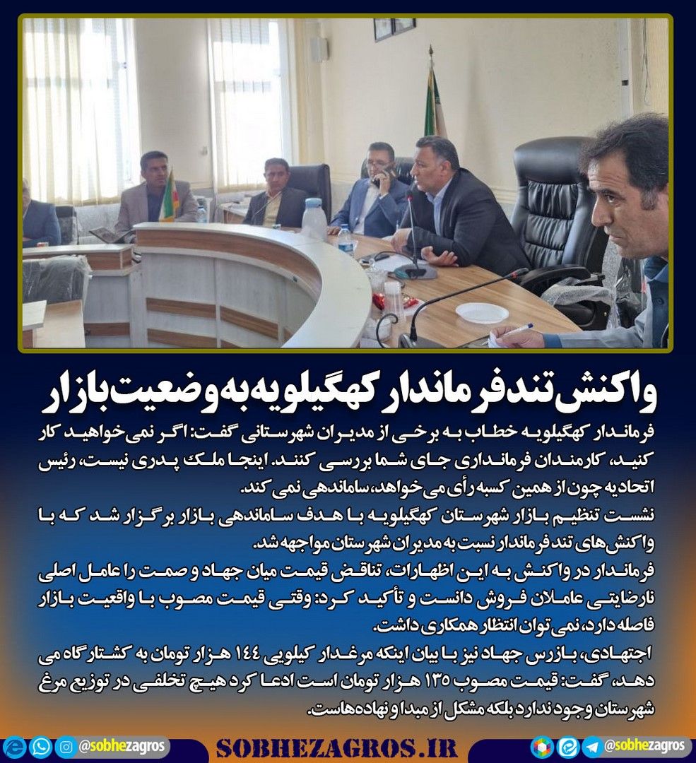 فرماندار کهگیلویه خطاب به برخی از مدیران شهرستانی گفت: اگر نمیخواهید کار کنید، کارمندان فرمانداری جای شما بررسی کنند. اینجا ملک پدری نیست، رئیس اتحادیه چون از همین کسبه رأی میخواهد، ساماندهی نمیکند.(اینجا)