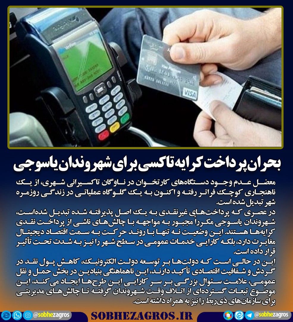 رانندگان تاکسی در شهر یاسوج به دلیل ترس از مالیات، از نصب کارتخوان خودداری میکنند و این امر شهروندان را با معضل پرداخت نقدی و اتلاف وقت مواجه کرده است.(اینجا)