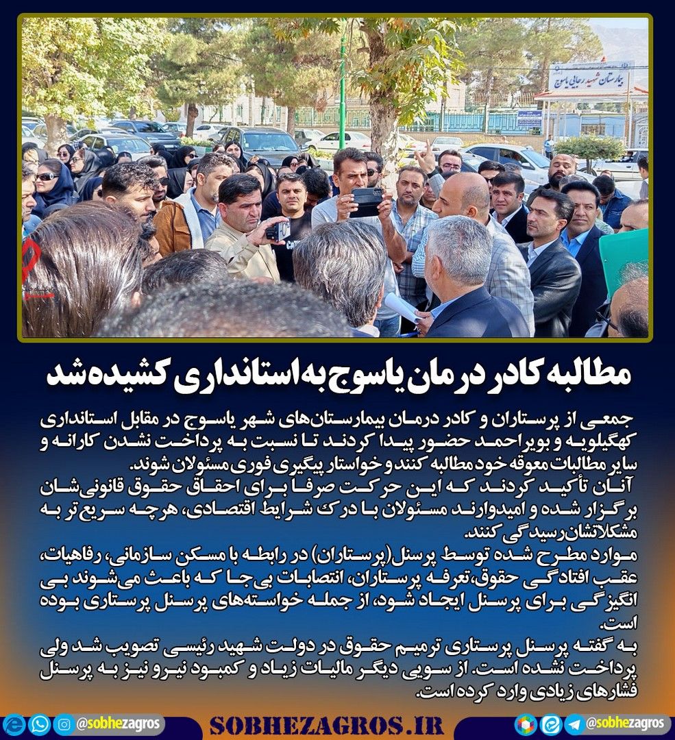 جمعی از پرسنل و پرستاران دانشگاه علوم پزشکی یاسوج به علت عدم پرداخت مطالبات معوقه خود مقابل استانداری کهگیلویه و بویراحمد حضور پیدا کردند.(اینجا)