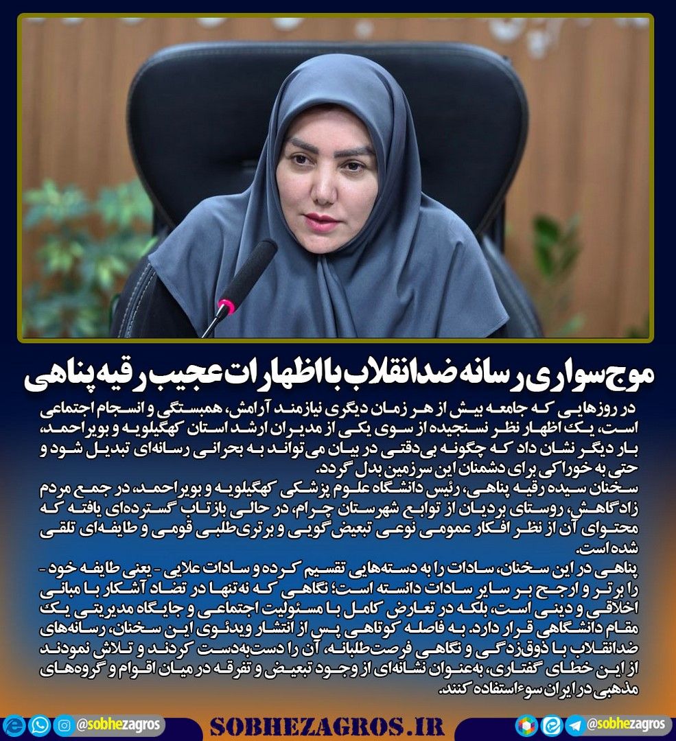 به گزارش پایگاه خبری تحلیلی «صبح زاگرس» موجسواری رسانه ضدانقلاب با اظهارات عجیب رقیه پناهی، چرا پهلوی عشایر کهگیلویهوبویراحمد را بمباران کرد؟، سوغات بانوی گچسارانی برای رهبر انقلاب و رئیسجمهور،مطالبه کادر درمان یاسوج به استانداری کشیده شد وعملیات اجرایی باند دوم خیرآباد_دهدشت آغاز شد از جمله عکس نوشته های خود از جمله عکس نوشته های صبح زاگرس است.