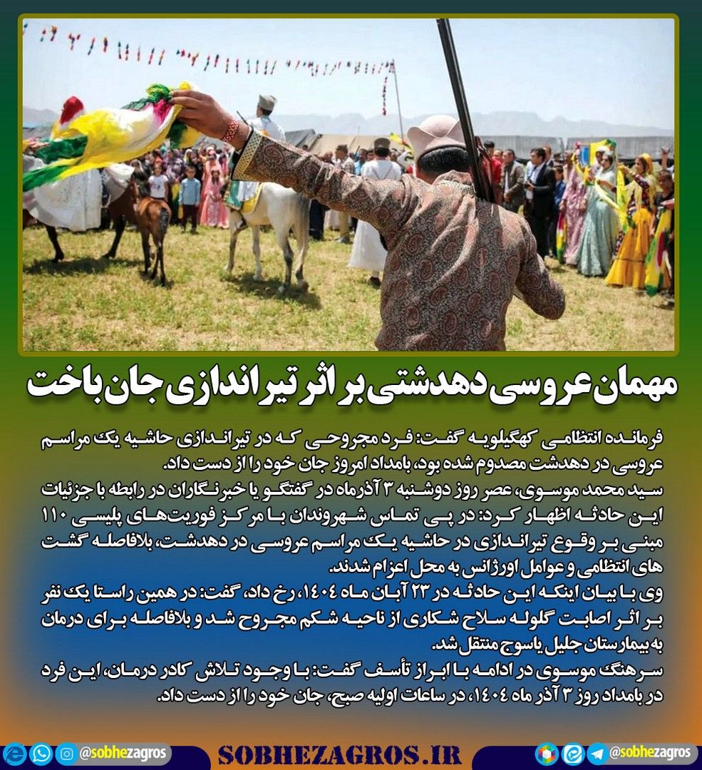 فرمانده انتظامی کهگیلویه گفت: فرد مجروحی که در تیراندازی حاشیه یک مراسم عروسی در دهدشت مصدوم شده بود، بامداد امروز جان خود را از دست داد.(اینجا)