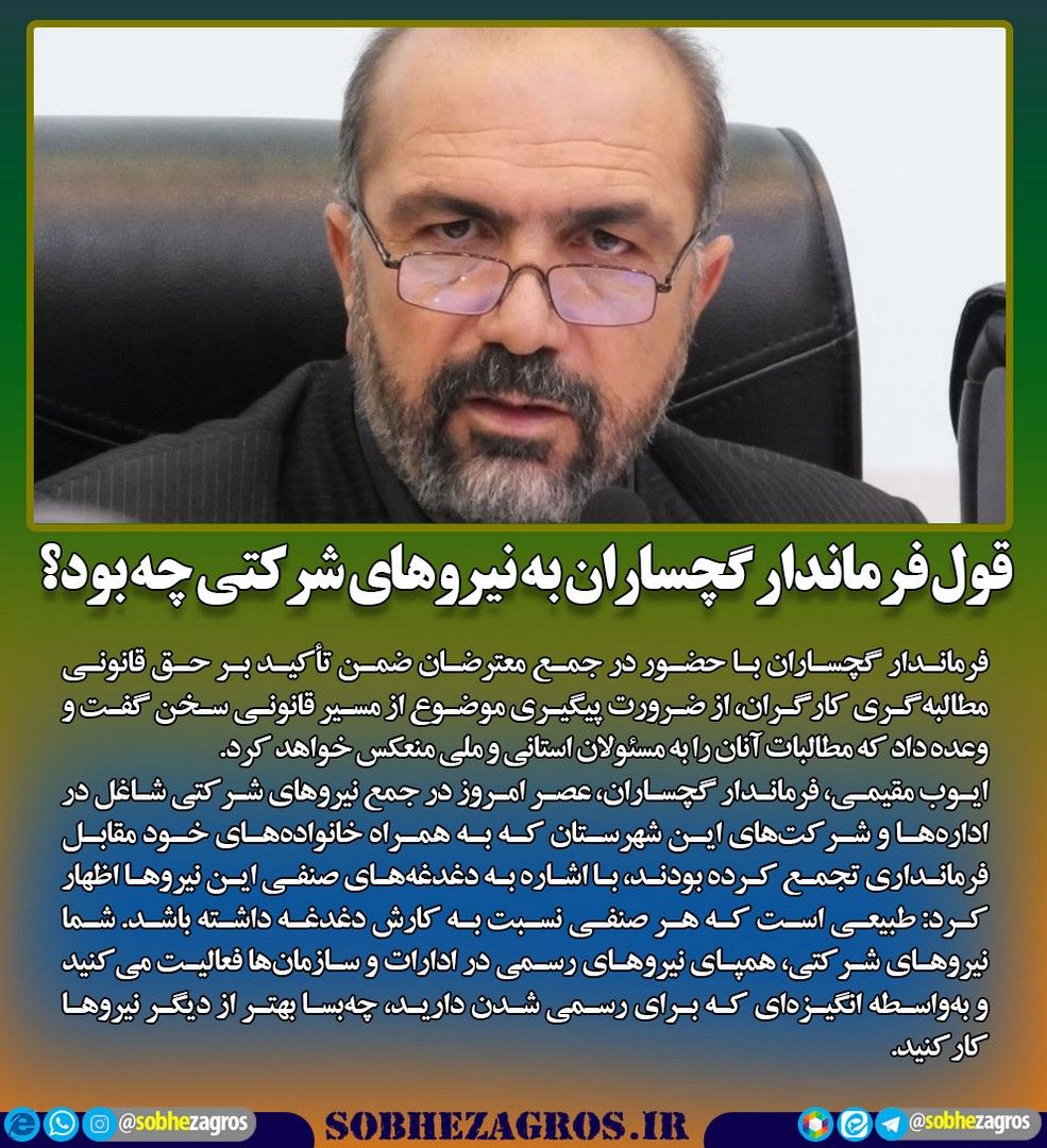 فرماندار گچساران با حضور در جمع معترضان ضمن تأکید بر حق قانونی مطالبهگری کارگران، از ضرورت پیگیری موضوع از مسیر قانونی سخن گفت و وعده داد که مطالبات آنان را به مسئولان استانی و ملی منعکس خواهد کرد.(اینجا)