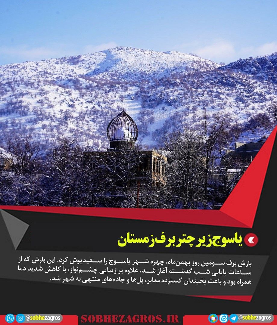 بارش برف سومین روز بهمنماه، چهره شهر یاسوج را سفیدپوش کرد. این بارش که از ساعات پایانی شب گذشته آغاز شد، علاوه بر زیبایی چشمنواز، با کاهش شدید دما همراه بود و باعث یخبندان گسترده معابر، پلها و جادههای منتهی به شهر شد.(اینجا)