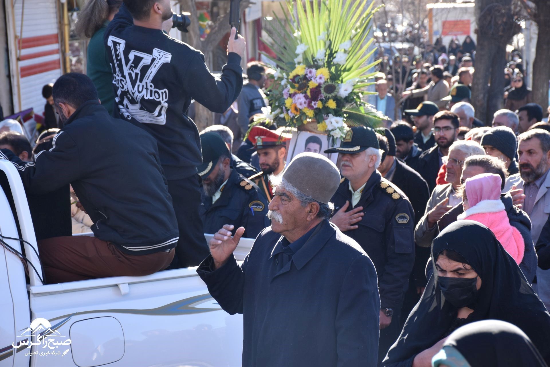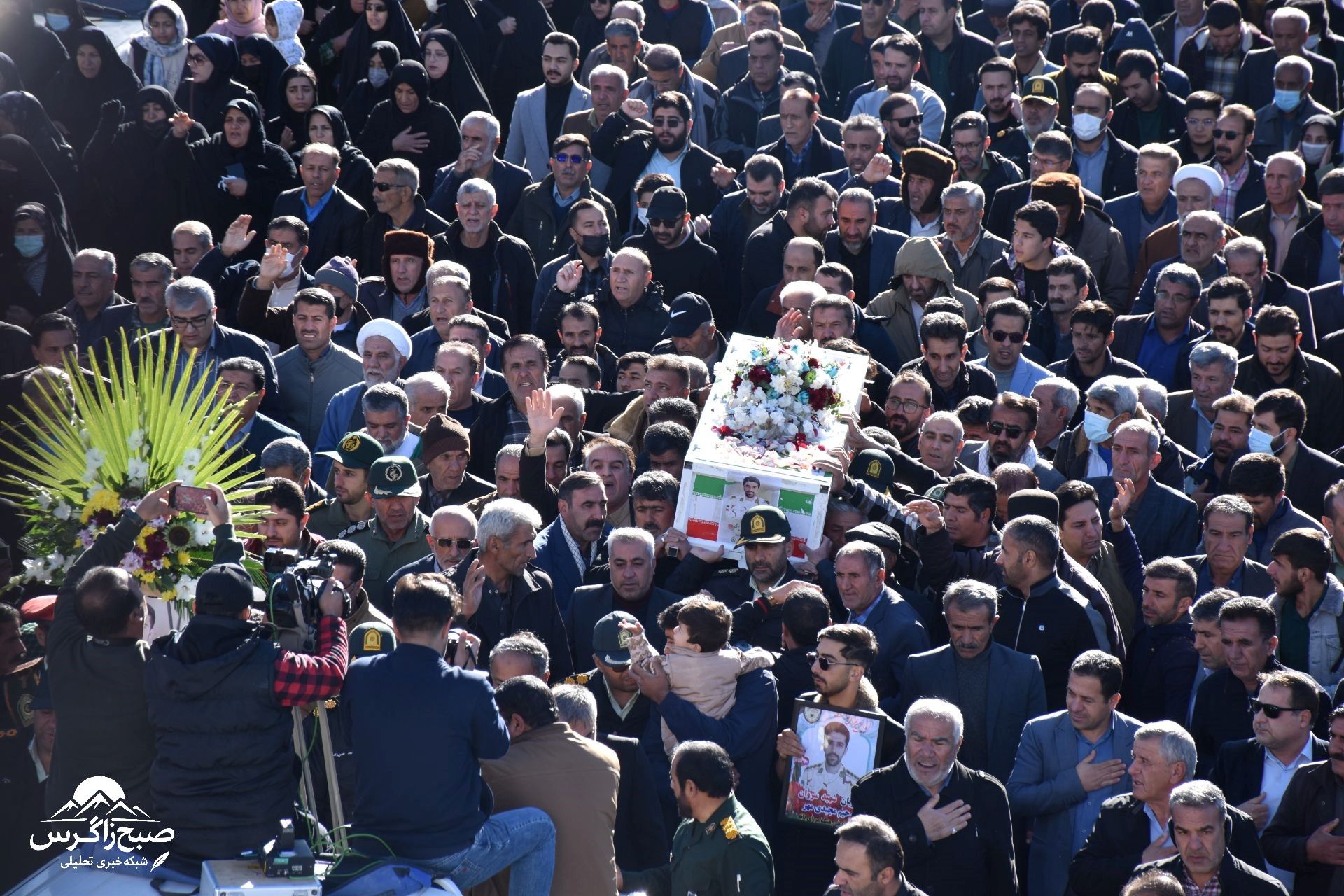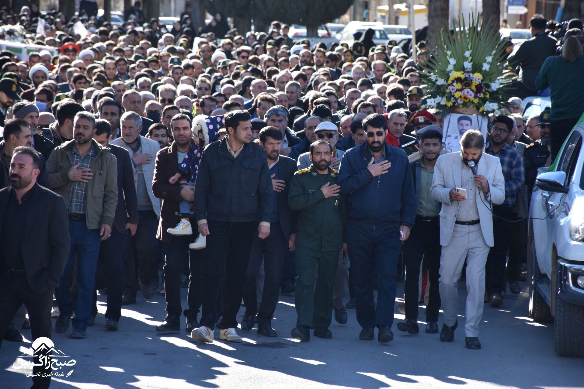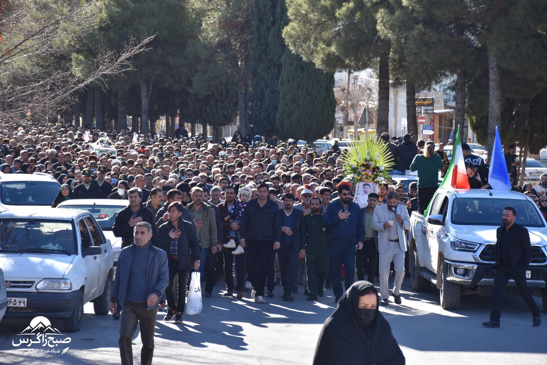 پیکر شهید، در میان انبوه جمعیت، بر روی دستان مردان محکم و چهرههای برافروخته از عشق، تاب میخورد. پرچم مقدس ایران، مانند پردهای از آتش و خون، تابلویی باشکوه بر گرد تابوت ایجاد کرده بود. نگاههای مردم، از پیرزنانی با چادرهای محلی تا جوانانی با مشتهای گره کرده، همه بر یک نقطه متمرکز بود: پیکر آن جوانی که برای حفظ این خاک، جوانیاش را در برفها و سنگلاخهای مرزی دفن کرده بود. صداى زمزمه ذکرلبیک یا خامنه ای و لا اله الا الله، چونان نجواى هماهنگ دلهاى یک ملت، فضا را آکنده بود.