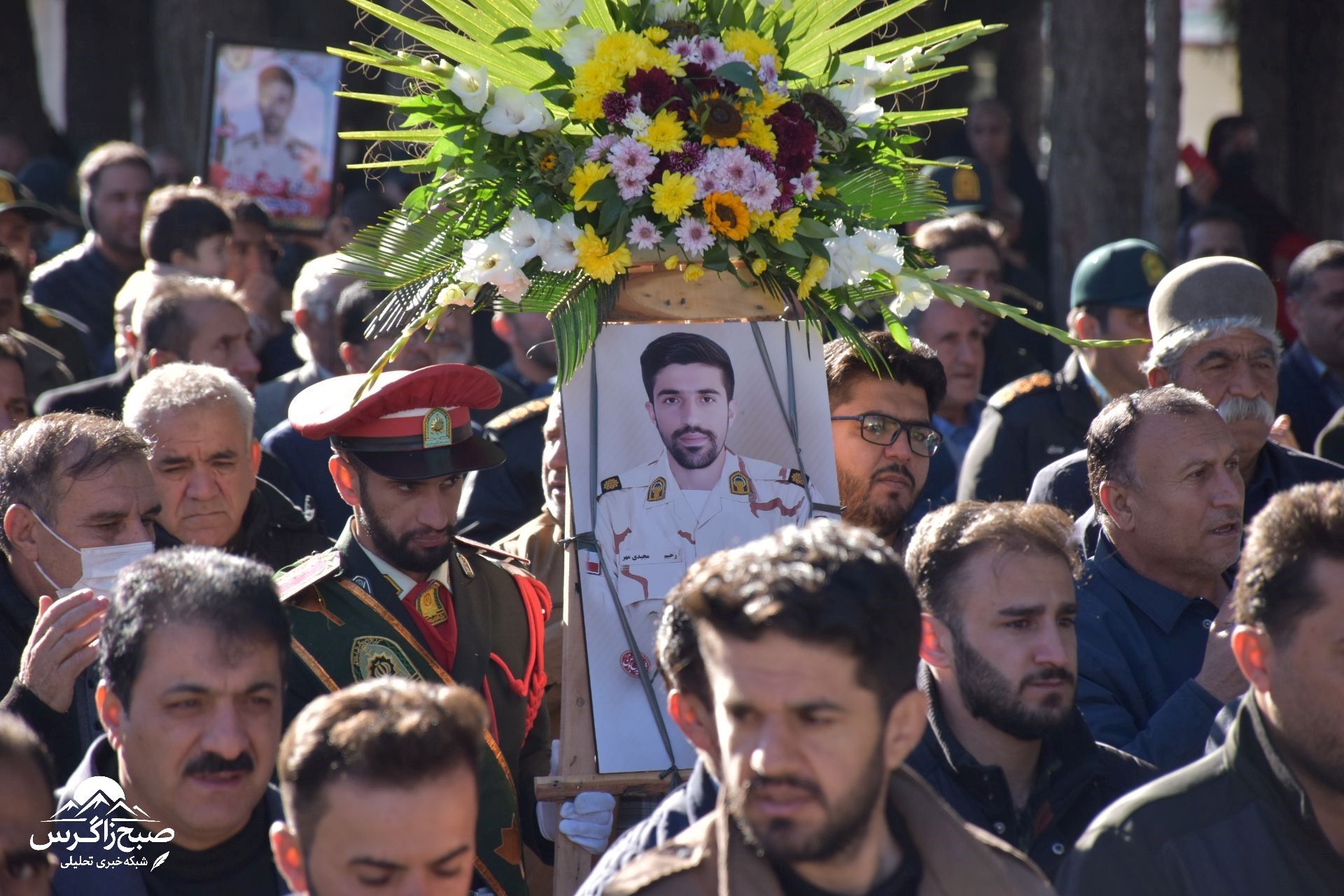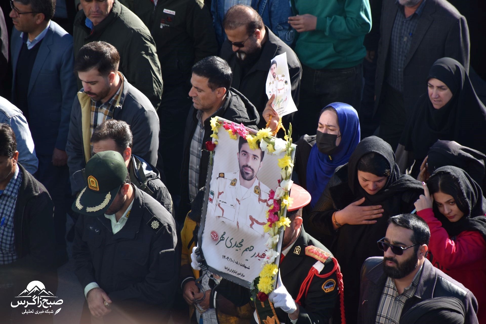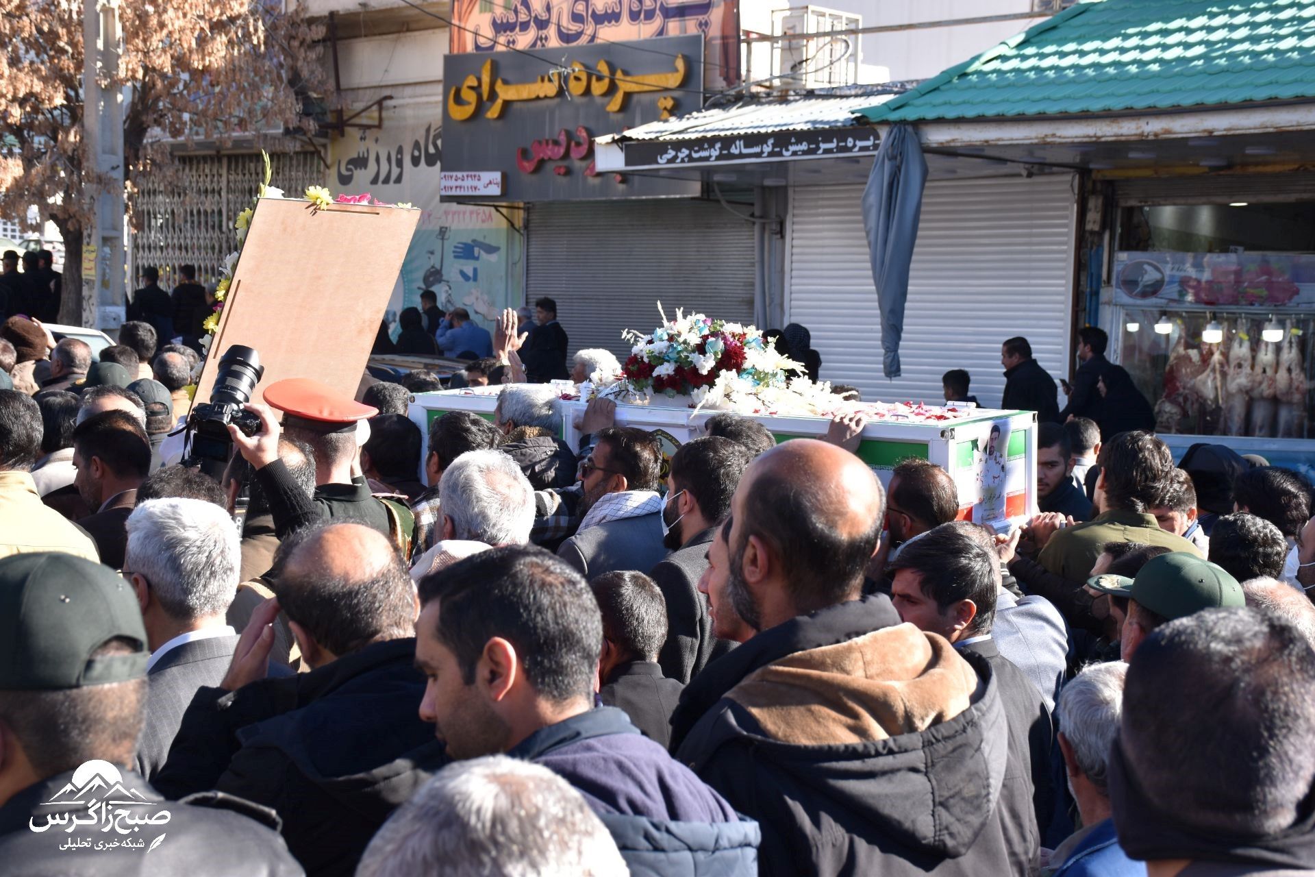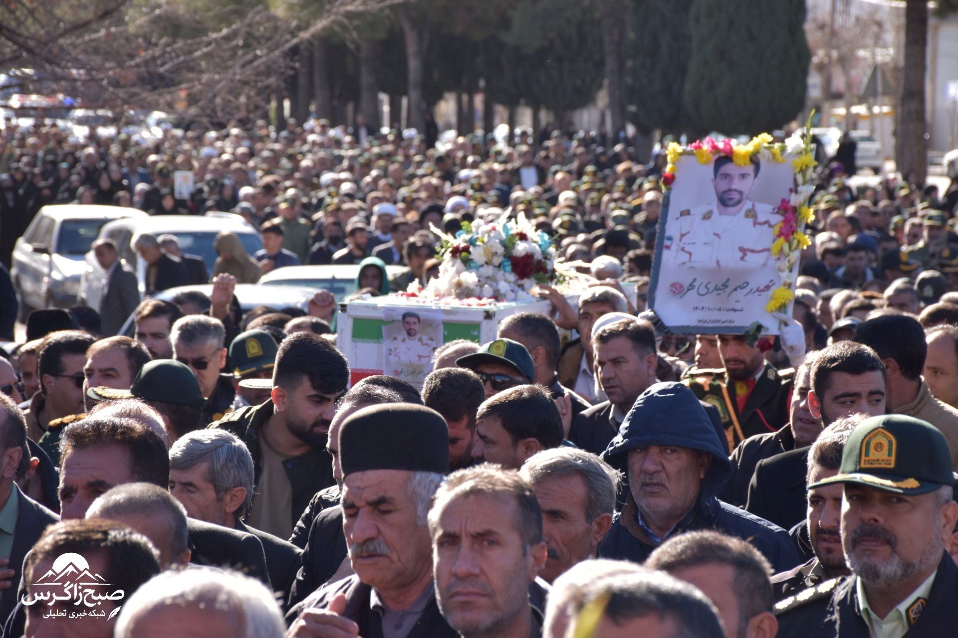 پیکر شهید، در میان انبوه جمعیت، بر روی دستان مردان محکم و چهرههای برافروخته از عشق، تاب میخورد. پرچم مقدس ایران، مانند پردهای از آتش و خون، تابلویی باشکوه بر گرد تابوت ایجاد کرده بود. نگاههای مردم، از پیرزنانی با چادرهای محلی تا جوانانی با مشتهای گره کرده، همه بر یک نقطه متمرکز بود: پیکر آن جوانی که برای حفظ این خاک، جوانیاش را در برفها و سنگلاخهای مرزی دفن کرده بود. صداى زمزمه ذکرلبیک یا خامنه ای و لا اله الا الله، چونان نجواى هماهنگ دلهاى یک ملت، فضا را آکنده بود.