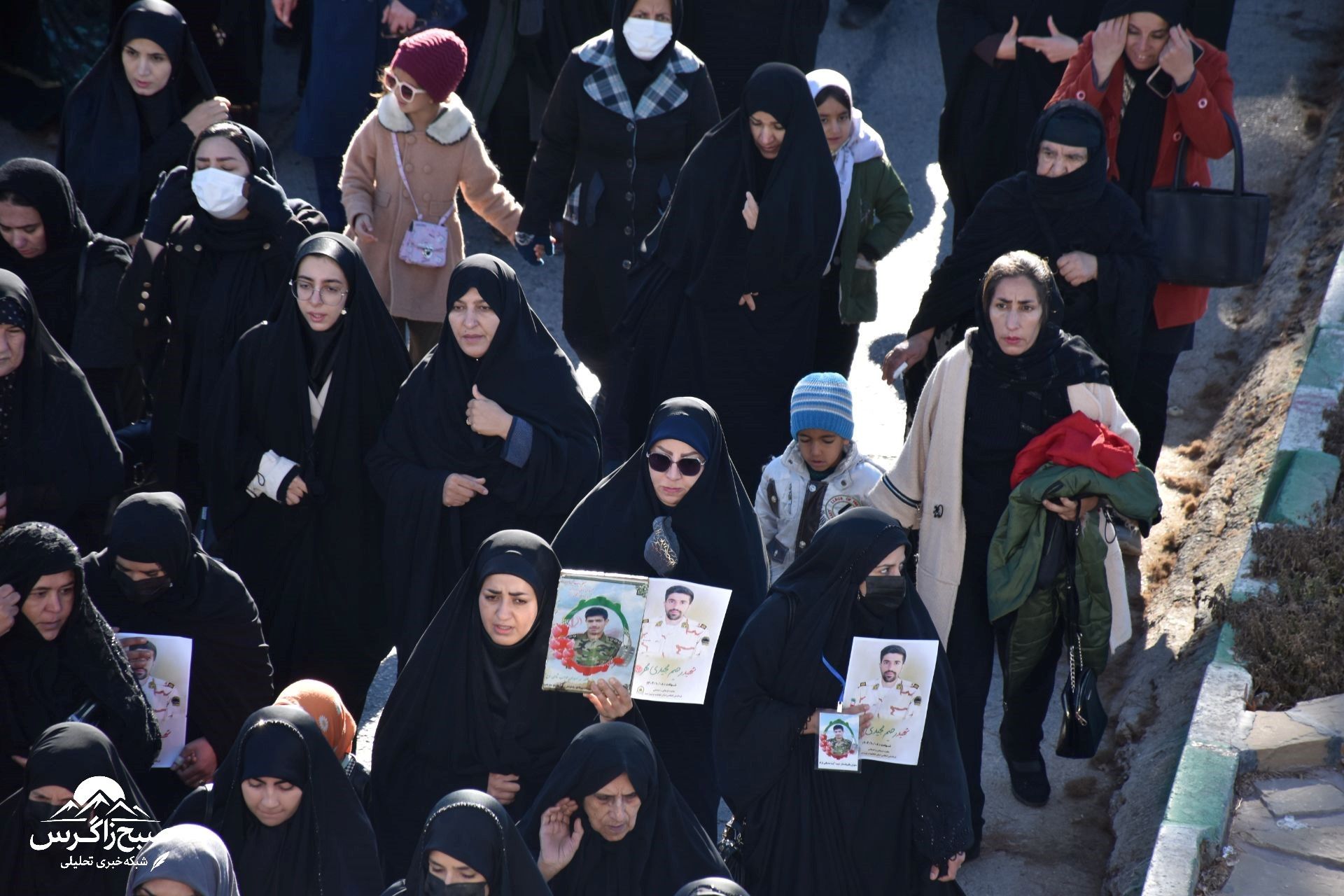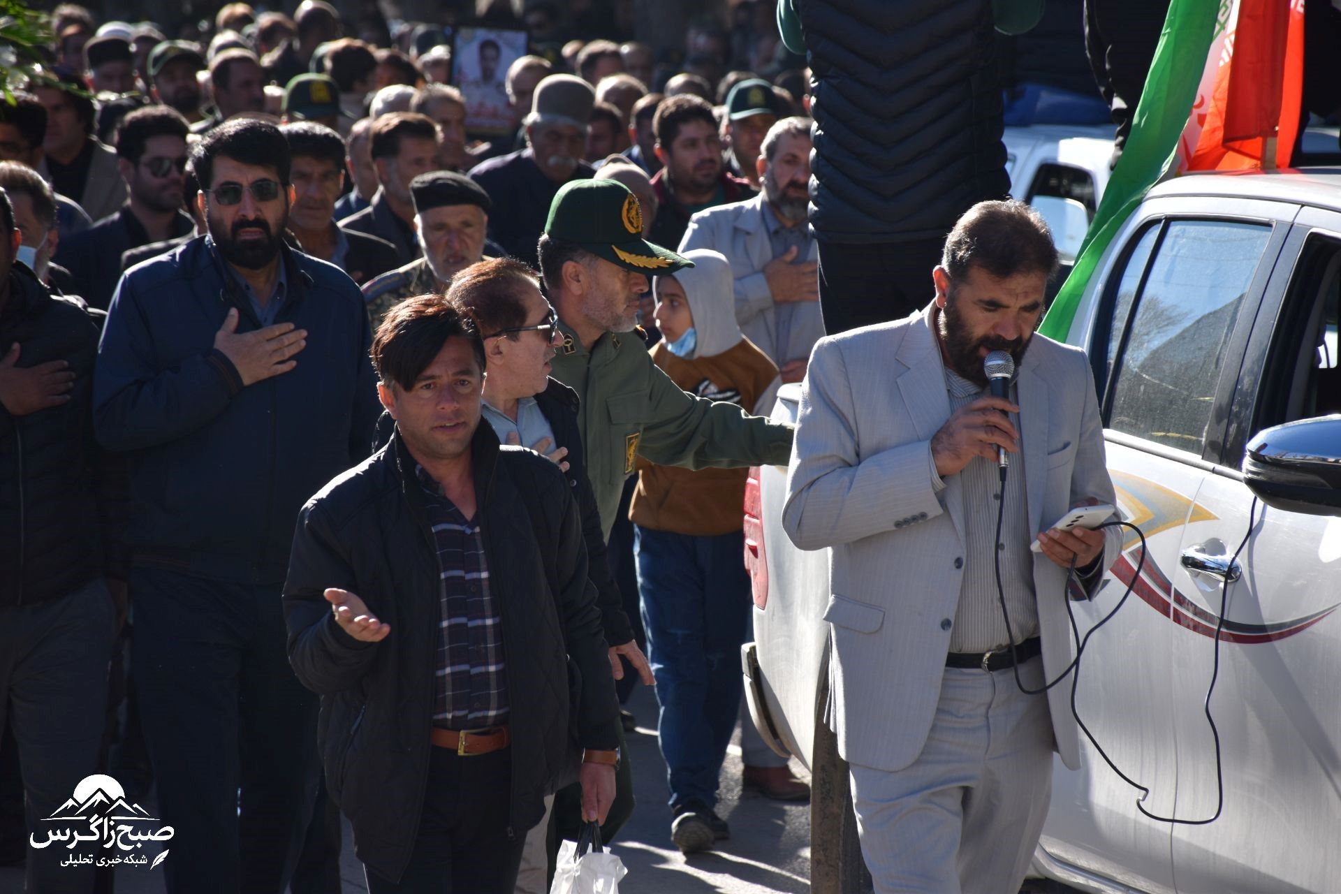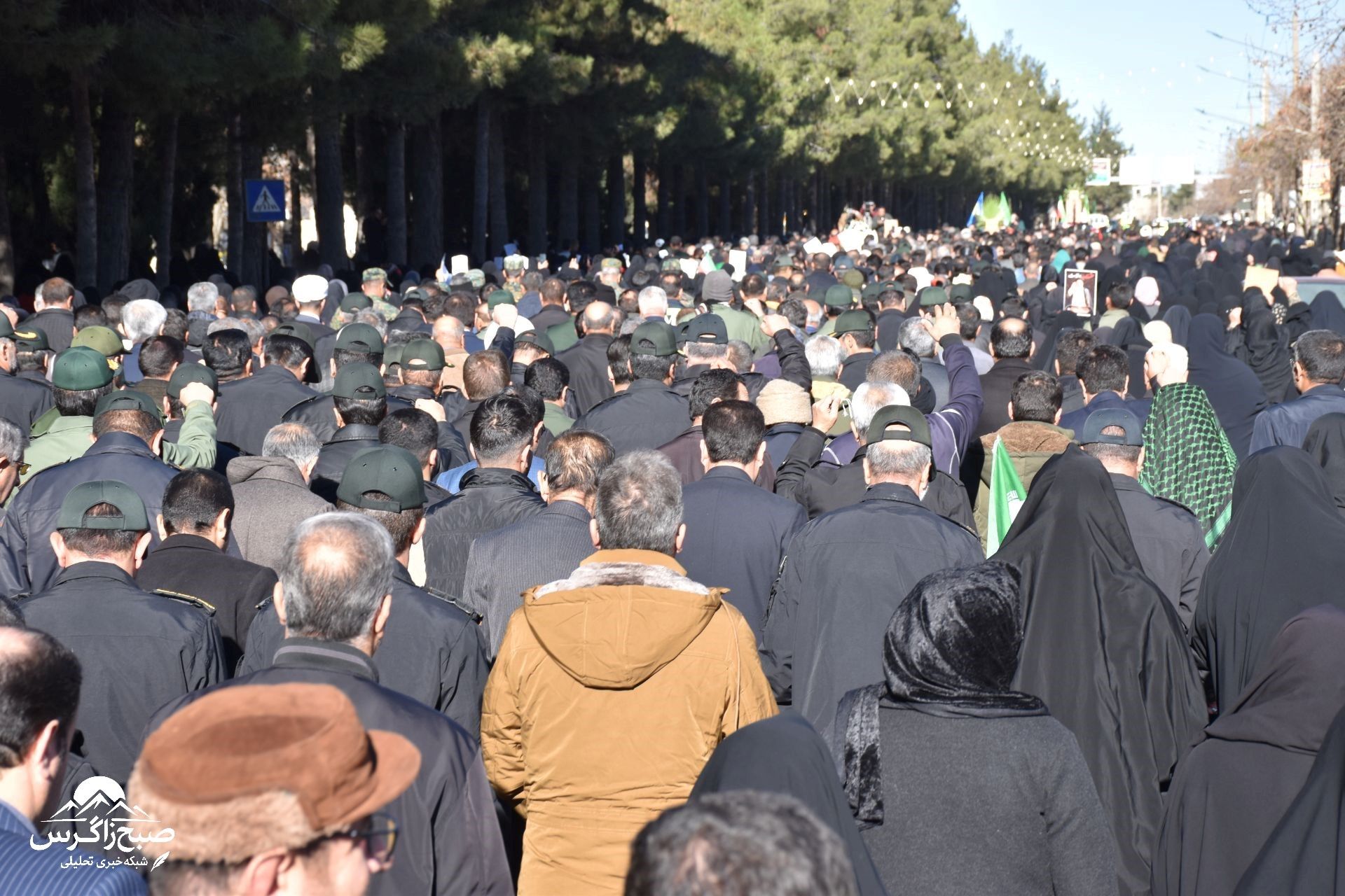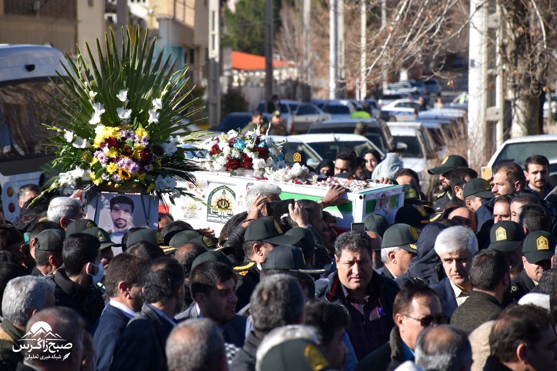 پیکر شهید، در میان انبوه جمعیت، بر روی دستان مردان محکم و چهرههای برافروخته از عشق، تاب میخورد. پرچم مقدس ایران، مانند پردهای از آتش و خون، تابلویی باشکوه بر گرد تابوت ایجاد کرده بود. نگاههای مردم، از پیرزنانی با چادرهای محلی تا جوانانی با مشتهای گره کرده، همه بر یک نقطه متمرکز بود: پیکر آن جوانی که برای حفظ این خاک، جوانیاش را در برفها و سنگلاخهای مرزی دفن کرده بود. صداى زمزمه ذکرلبیک یا خامنه ای و لا اله الا الله، چونان نجواى هماهنگ دلهاى یک ملت، فضا را آکنده بود.