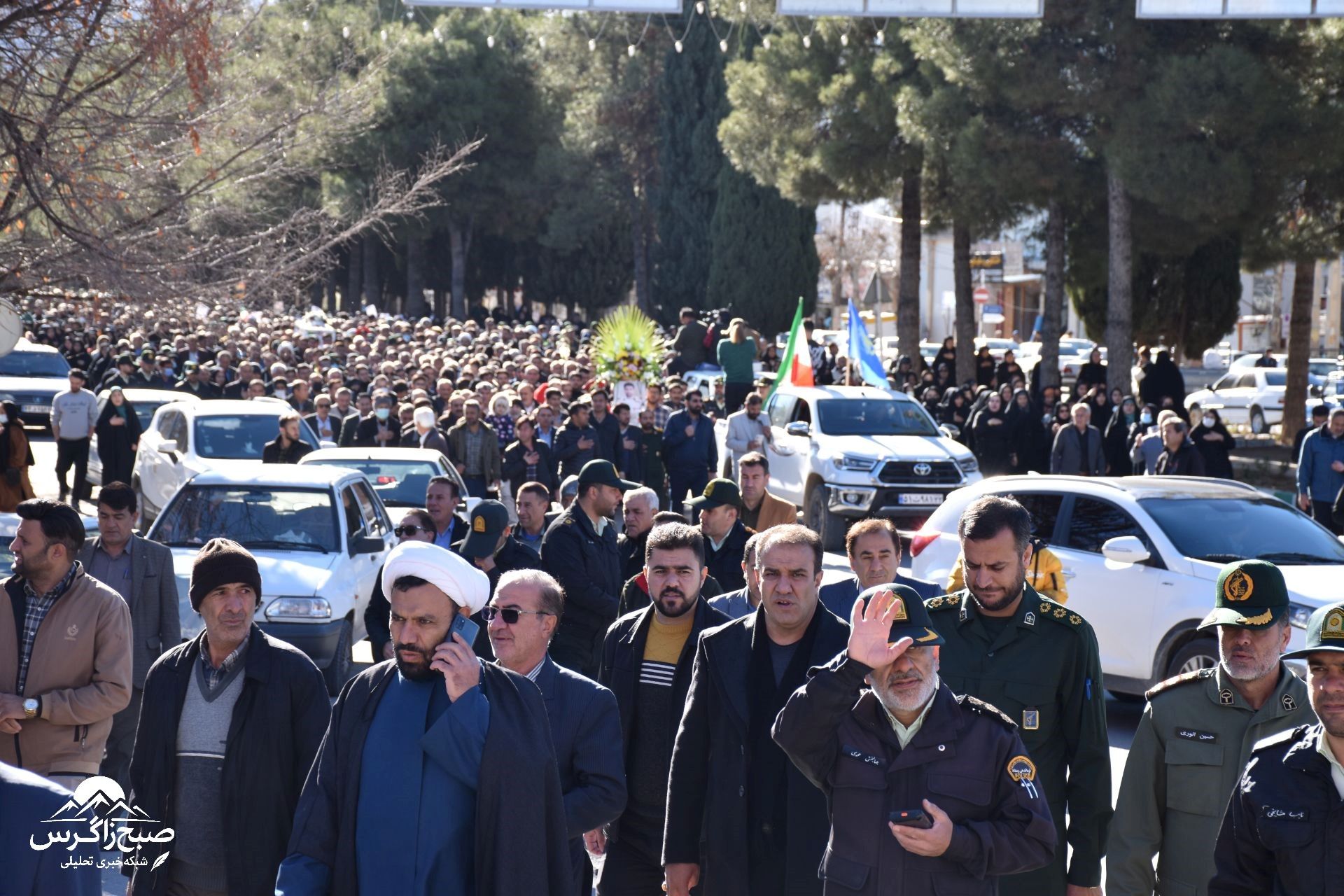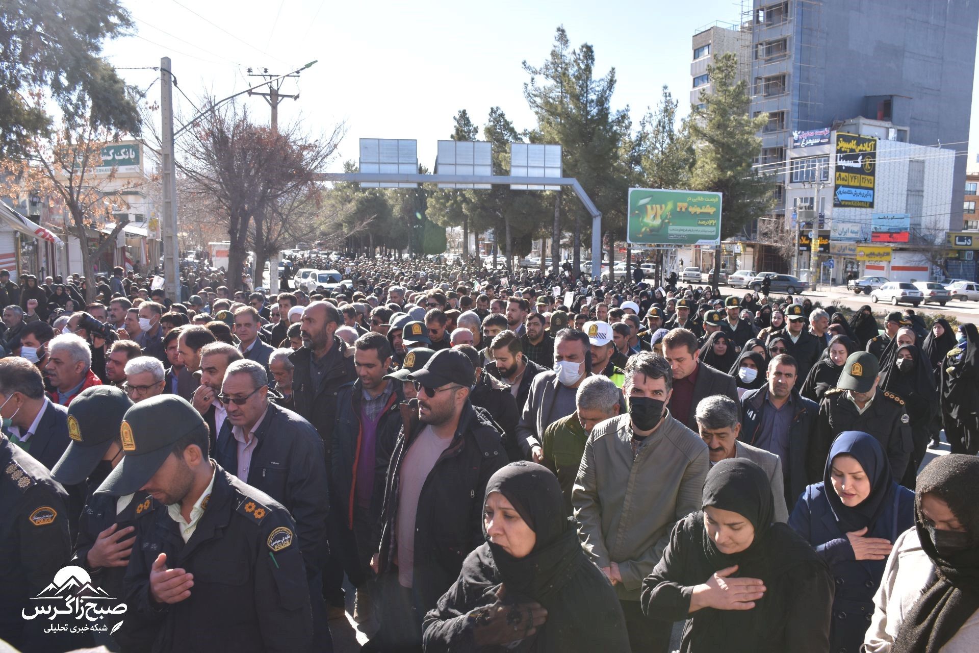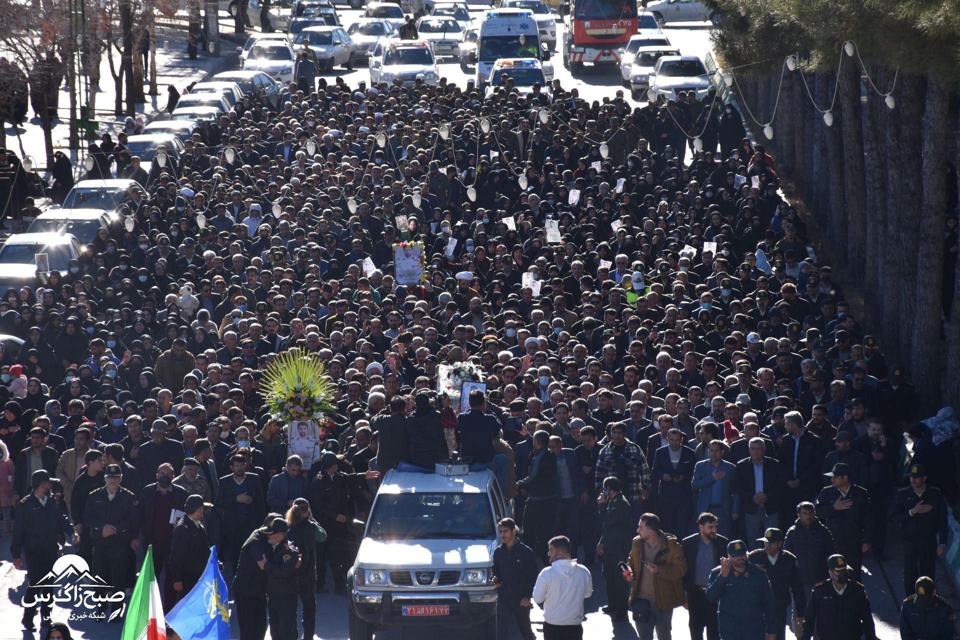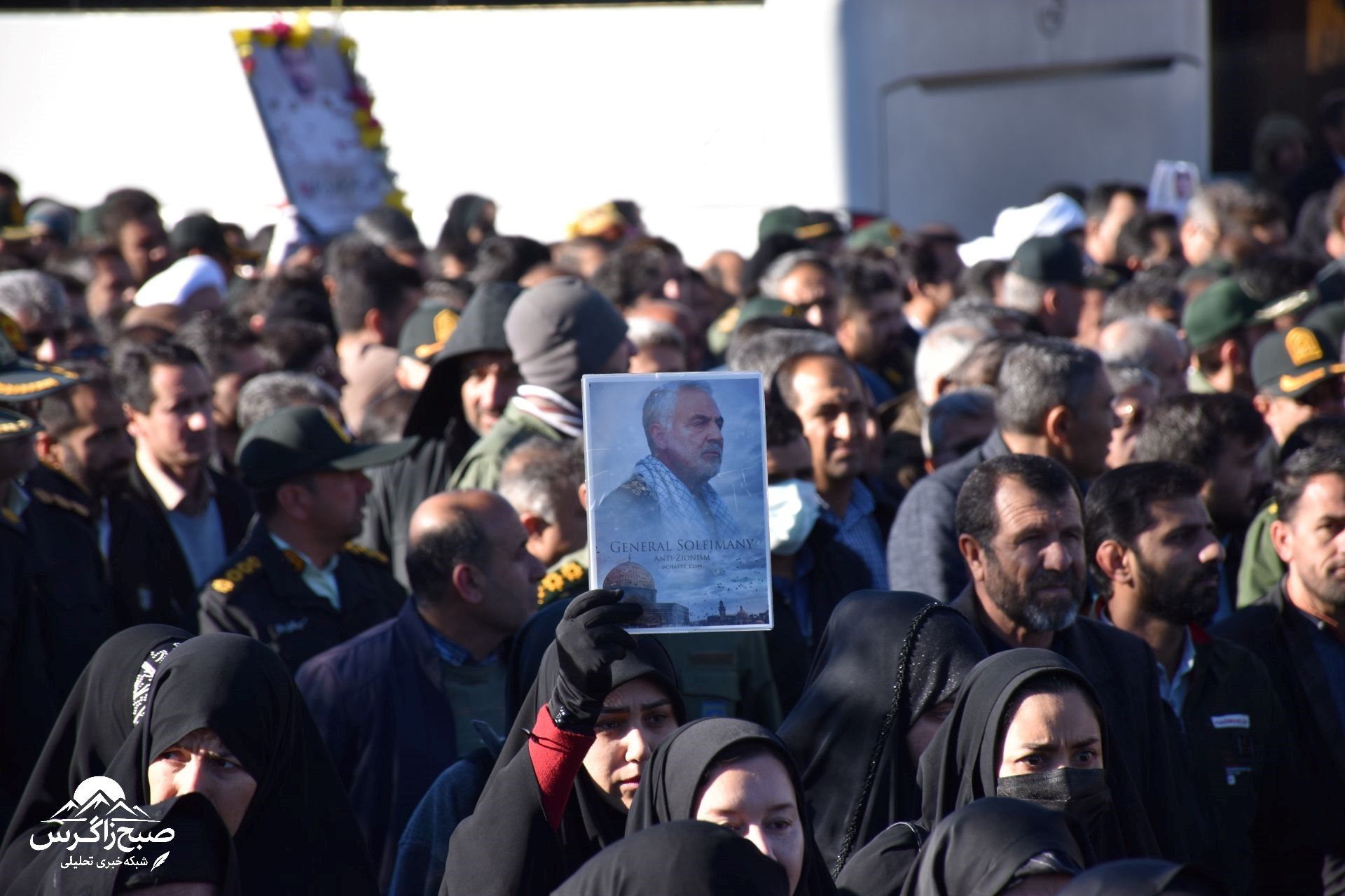 پیکر شهید، در میان انبوه جمعیت، بر روی دستان مردان محکم و چهرههای برافروخته از عشق، تاب میخورد. پرچم مقدس ایران، مانند پردهای از آتش و خون، تابلویی باشکوه بر گرد تابوت ایجاد کرده بود. نگاههای مردم، از پیرزنانی با چادرهای محلی تا جوانانی با مشتهای گره کرده، همه بر یک نقطه متمرکز بود: پیکر آن جوانی که برای حفظ این خاک، جوانیاش را در برفها و سنگلاخهای مرزی دفن کرده بود. صداى زمزمه ذکرلبیک یا خامنه ای و لا اله الا الله، چونان نجواى هماهنگ دلهاى یک ملت، فضا را آکنده بود.