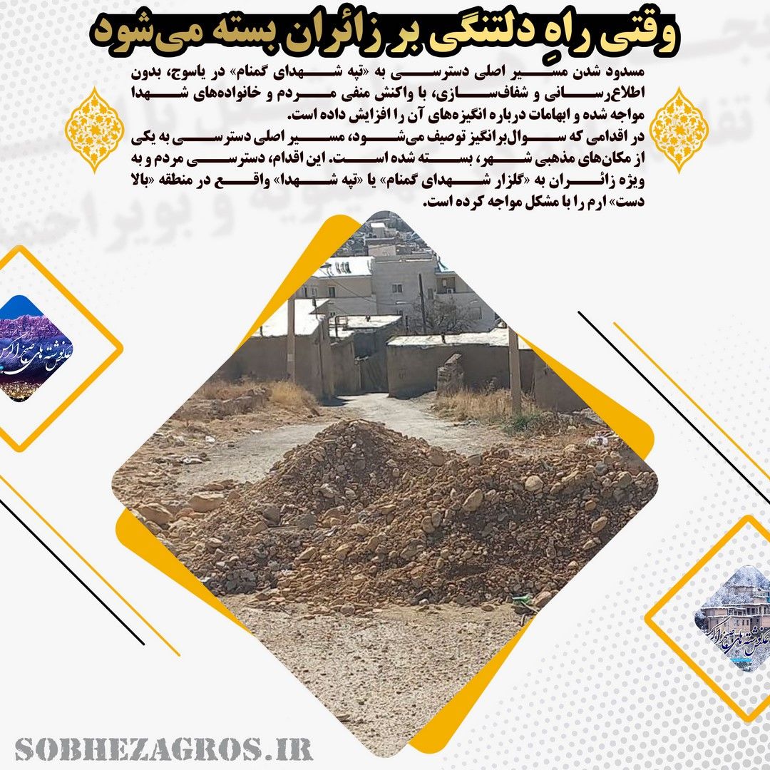 مسدود شدن مسیر اصلی دسترسی به «تپه شهدای گمنام» در یاسوج، بدون اطلاعرسانی و شفافسازی، با واکنش منفی مردم و خانوادههای شهدا مواجه شده و ابهامات درباره انگیزههای آن را افزایش داده است.(اینجا)