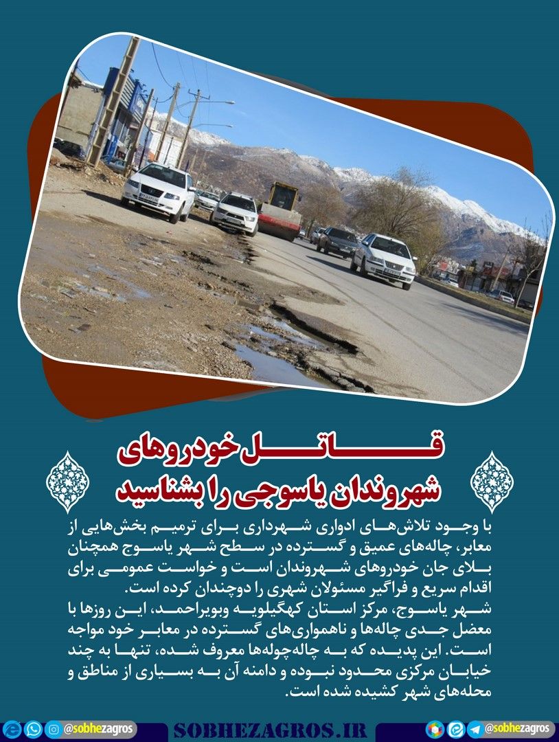 با وجود تلاشهای ادواری شهرداری برای ترمیم بخشهایی از معابر، چالههای عمیق و گسترده در سطح شهر یاسوج همچنان بلای جان خودروهای شهروندان است و خواست عمومی برای اقدام سریع و فراگیر مسئولان شهری را دوچندان کرده است.(اینجا)