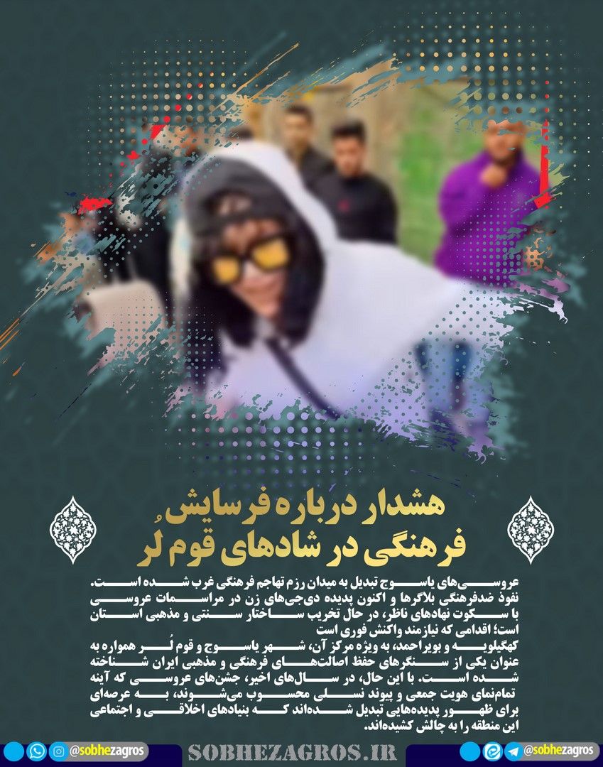 عروسیهای یاسوج تبدیل به میدان رزم تهاجم فرهنگی غرب شده است. نفوذ ضدفرهنگی بلاگرها و اکنون پدیده دیجیهای زن در مراسمات عروسی با سکوت نهادهای ناظر، در حال تخریب ساختار سنتی و مذهبی استان است؛ اقدامی که نیازمند واکنش فوری است(اینجا)