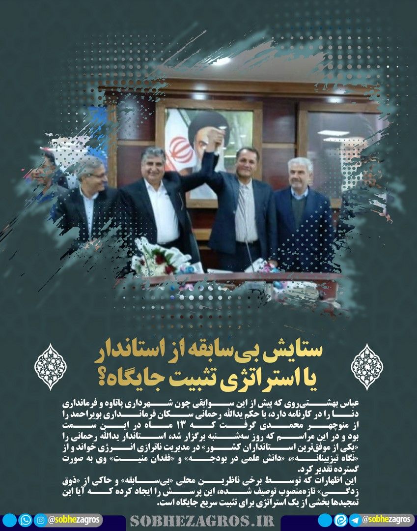 به گزارش پایگاه خبری تحلیلی«صبحزاگرس» ستایش بیسابقه از استاندار یا استراتژی تثبیت جایگاه؟، قاتل خودروهای شهروندان یاسوجی را بشناسید، هشدار درباره فرسایش فرهنگی در شادهای قوم لُر،وقتی راهِ دلتنگی بر زائران بسته میشود و حفظ محیط زیست؛ مسئولیتی فراتر از شعار از جمله عکس نوشته های صبح زاگرس است.