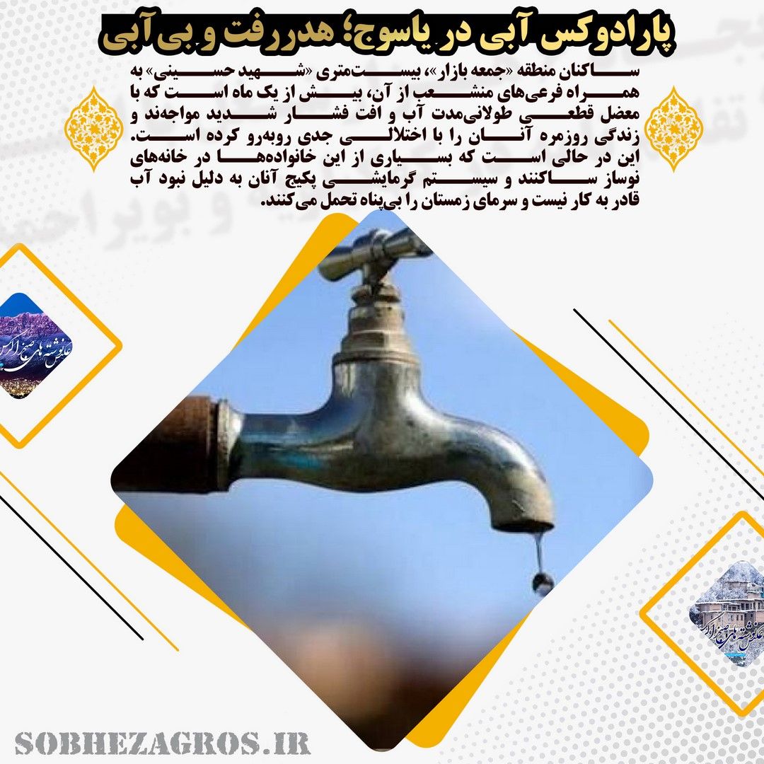 ساکنان محله 20متری شهیدحسینی یاسوج، در نزدیکی جمعه بازار بیش از یک ماه است که تنها روزی ۵ ساعت آبِ کمفشار دریافت میکنند و پیگیریهای مکررشان بیپاسخ مانده، این درحالی است که در محلات دیگر هر روز شاهد هدررفت آب هستیم.(اینجا)