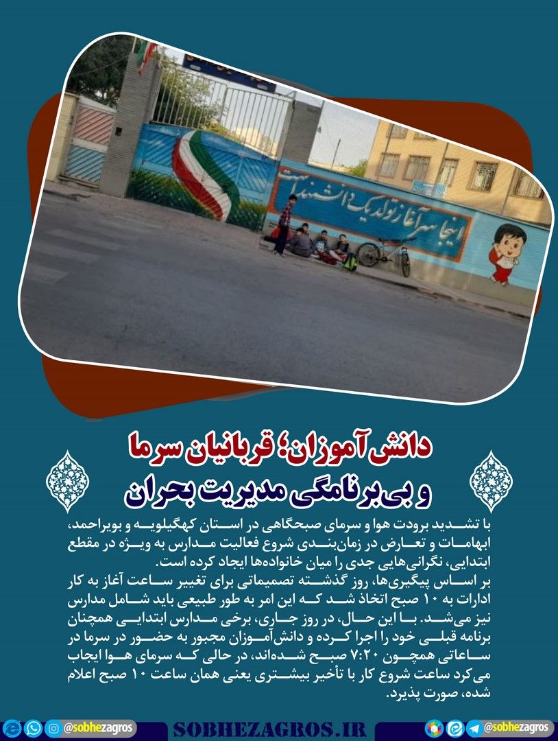 با تشدید برودت هوا و سرمای صبحگاهی در استان کهگیلویه و بویراحمد، ابهامات و تعارض در زمانبندی شروع فعالیت مدارس به ویژه در مقطع ابتدایی، نگرانیهایی جدی را میان خانوادهها ایجاد کرده است.(اینجا)