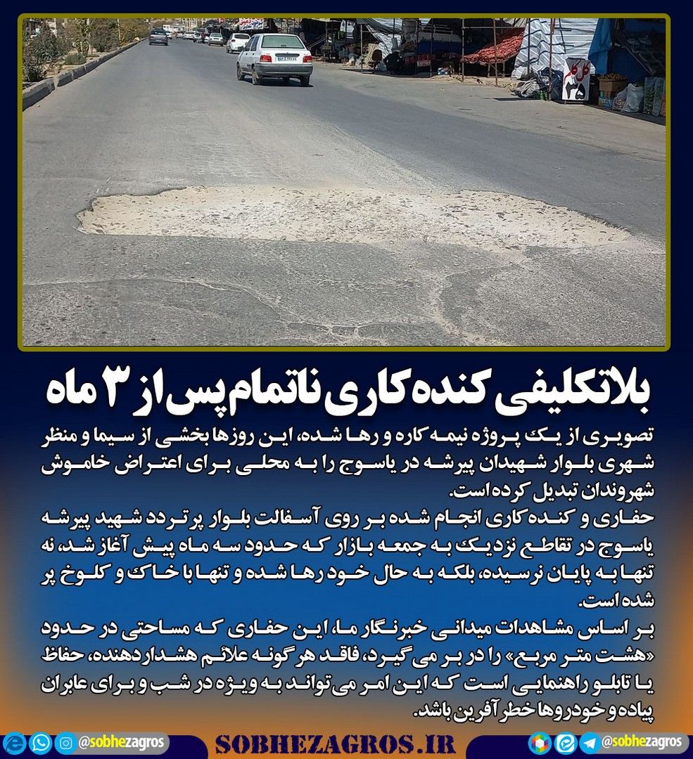 تصویری از یک پروژه نیمهکاره و رها شده، این روزها بخشی از سیما و منظر شهری بلوار شهیدان پیرشه در یاسوج را به محلی برای اعتراض خاموش شهروندان تبدیل کرده است.(اینجا)