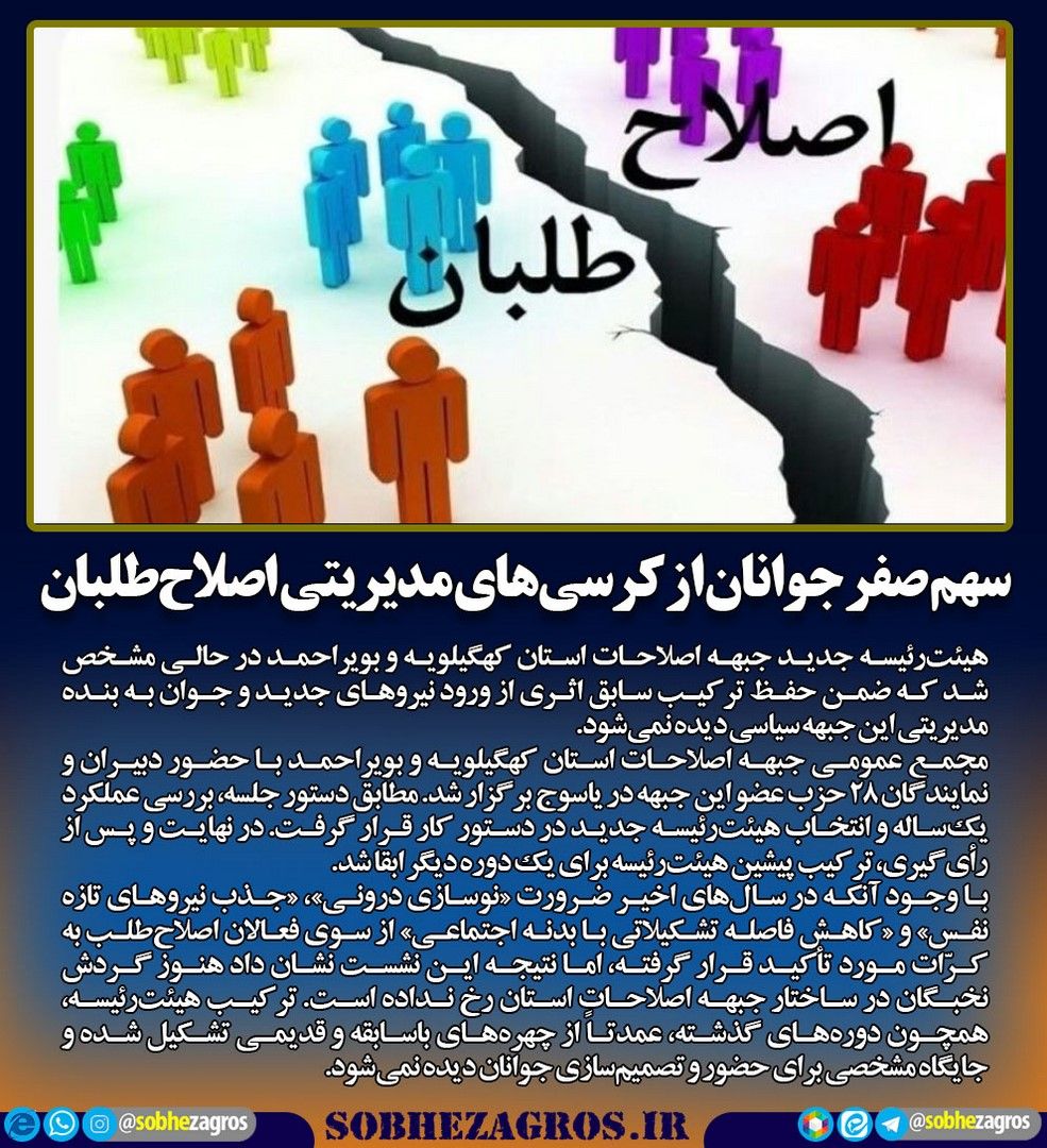 هیئترئیسه جدید جبهه اصلاحات استان کهگیلویه و بویراحمد در حالی مشخص شد که ضمن حفظ ترکیب سابق اثری از ورود نیروهای جدید و جوان به بنده مدیریتی این جبهه سیاسی دیده نمیشود.(اینجا)