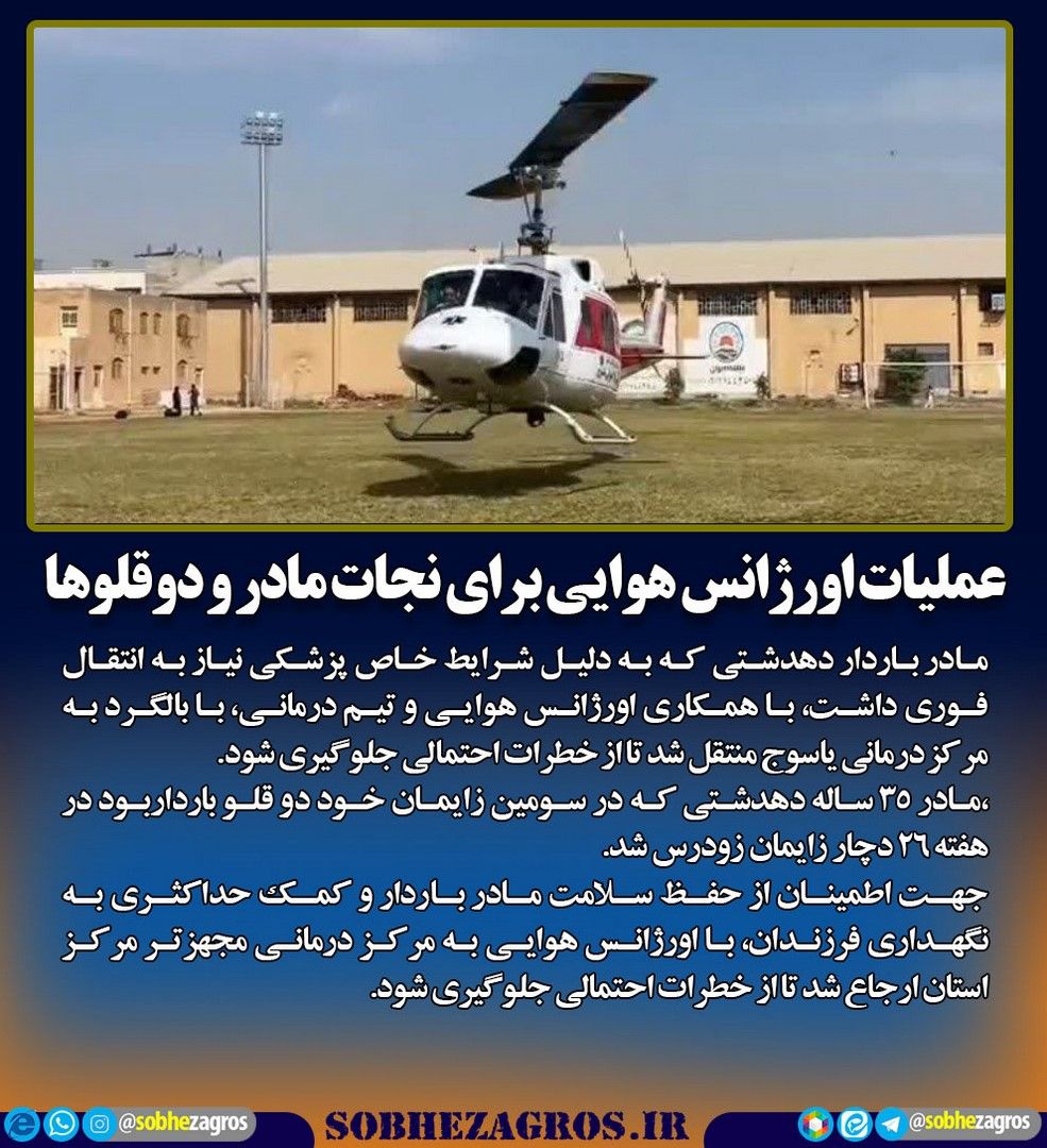 مادر باردار دهدشتی که به دلیل شرایط خاص پزشکی نیاز به انتقال فوری داشت، با همکاری اورژانس هوایی و تیم درمانی، با بالگرد به مرکز درمانی یاسوج منتقل شد تا از خطرات احتمالی جلوگیری شود.(اینجا)