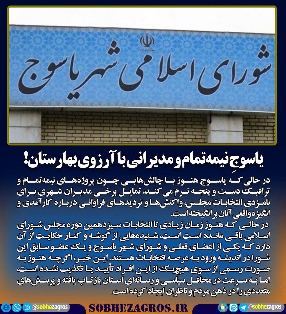 در حالیکه یاسوج هنوز با چالشهایی چون پروژههای نیمهتمام و ترافیک دست و پنجه نرم میکند، تمایل برخی مدیران شهری برای نامزدی انتخابات مجلس، واکنشها و تردیدهای فراوانی درباره کارآمدی و انگیزه واقعی آنان برانگیخته است.(اینجا)