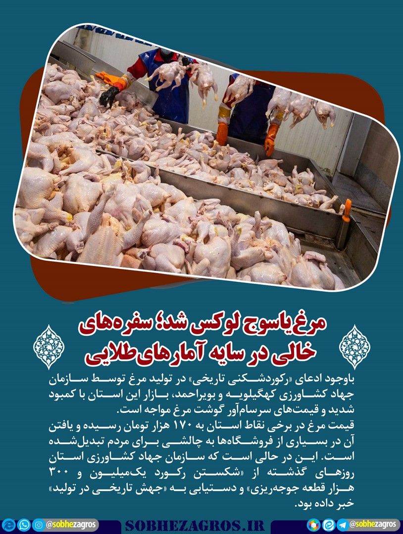 باوجود ادعای «رکوردشکنی تاریخی» در تولید مرغ توسط سازمان جهاد کشاورزی کهگیلویه و بویراحمد، بازار این استان با کمبود شدید و قیمتهای سرسامآور گوشت مرغ مواجه است.(اینجا)