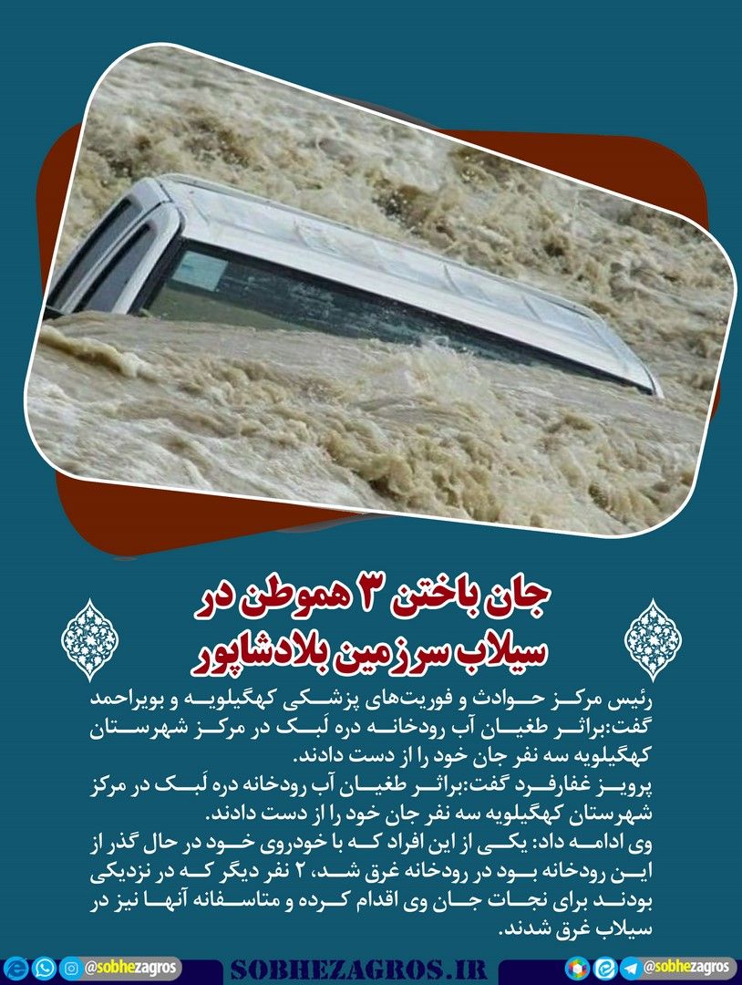 رئیس مرکز حوادث و فوریتهای پزشکی کهگیلویه و بویراحمد گفت:براثر طغیان آب رودخانه دره لَبک در مرکز شهرستان کهگیلویه سه نفر جان خود را از دست دادند.(اینجا)