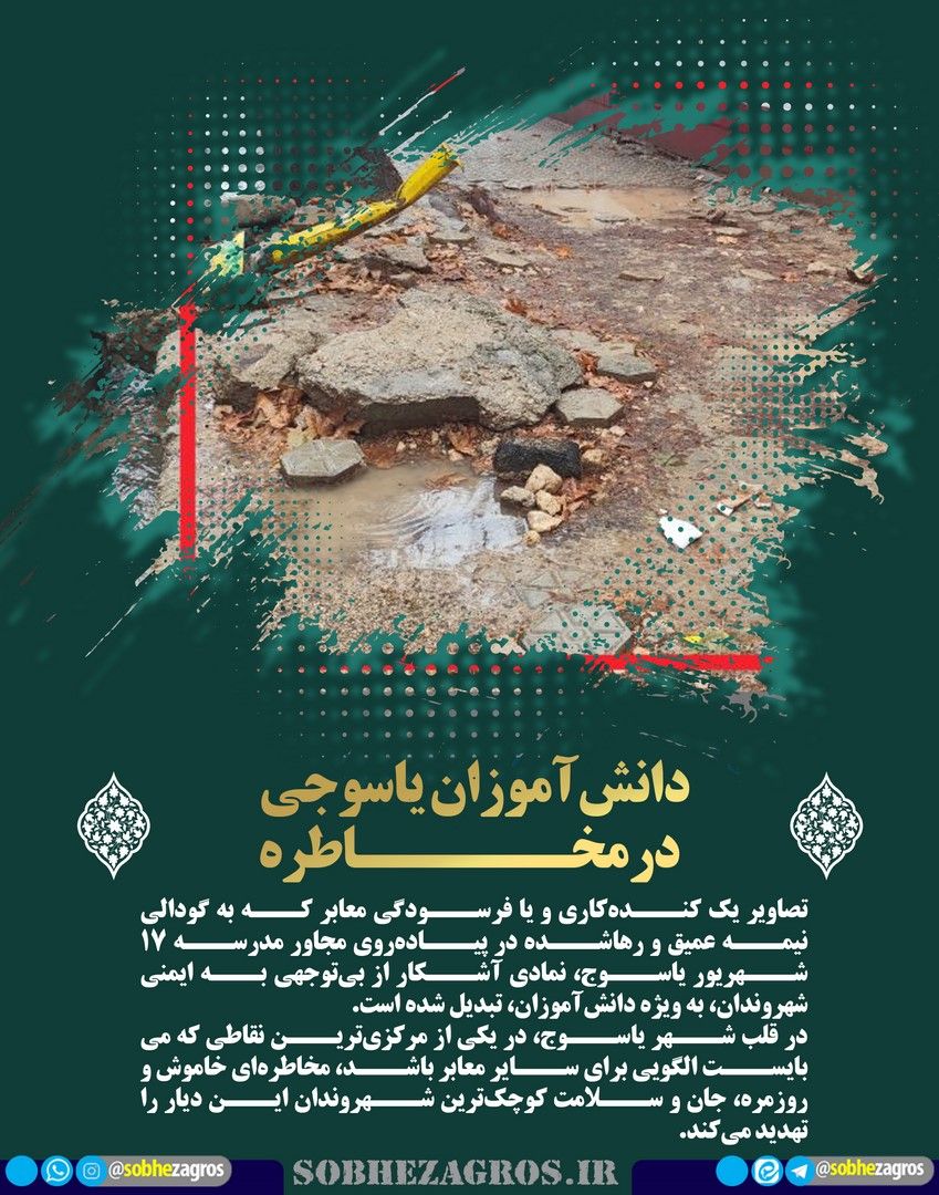 تصاویر یک کندهکاری و یا فرسودگی معابر که به گودالی نیمه عمیق و رهاشده در پیادهروی مجاور مدرسه ۱۷ شهریور یاسوج، نمادی آشکار از بیتوجهی به ایمنی شهروندان، به ویژه دانشآموزان، تبدیل شده است.(اینجا)