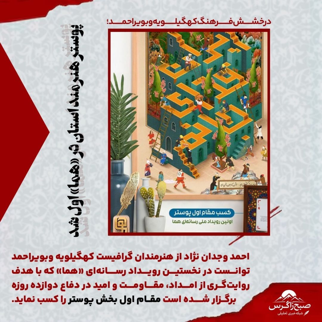 احمد وجدان نژاد از هنرمندان گرافیست کهگیلویه وبویراحمد توانست در نخستین رویداد رسانهای «هما» که با هدف روایتگری از امداد، مقاومت و امید در دفاع دوازدهروزه برگزار شده است مقام اول بخش پوستر را کسب نماید.(اینجا)