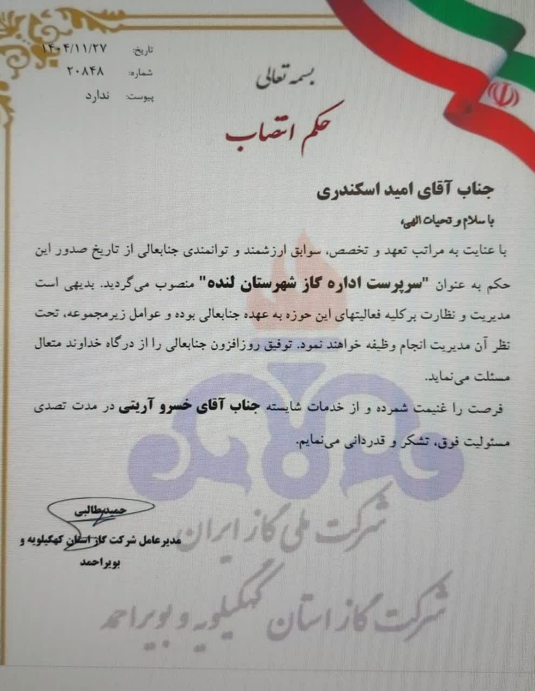 گفتنی است امید اسکندری از نیروهای باسابقه و باتجربه اداره گاز شهرستان کهگیلویه بوده که با حکم مسئولان مربوطه، بهعنوان سرپرست جدید اداره گاز شهرستان لنده منصوب شده است.